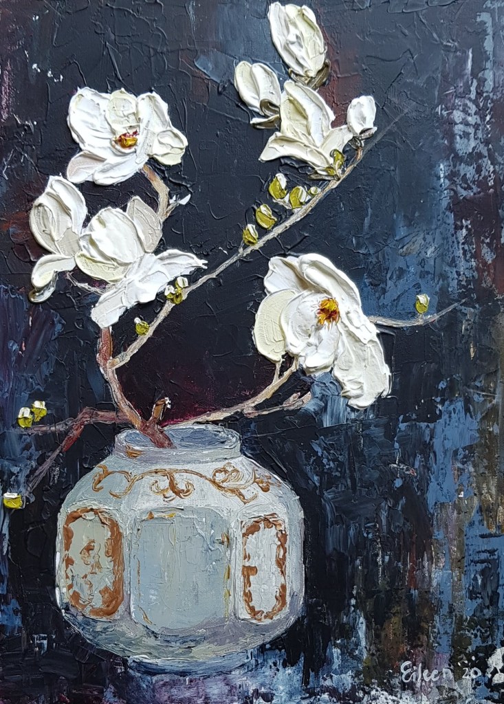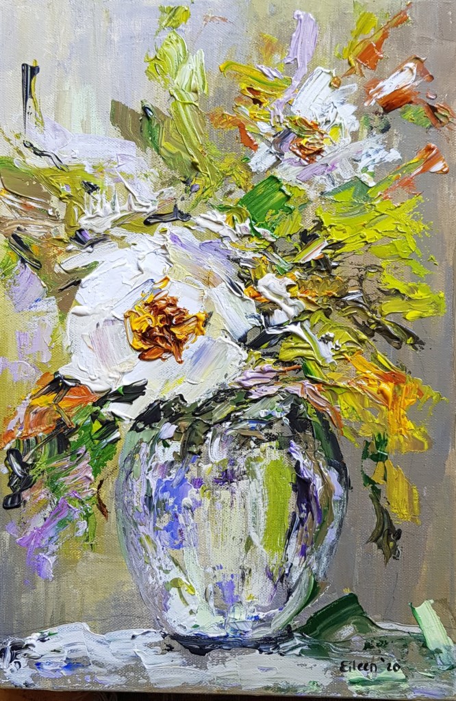My work the last while has been moving in a more painterly direction relying more on colour, texture and stroke to express form. Using a palette knife and colour shapers have made this a natural progression in my work. Detail now needs to be simplified, and alternative solutions found to creating shape rather than using line.