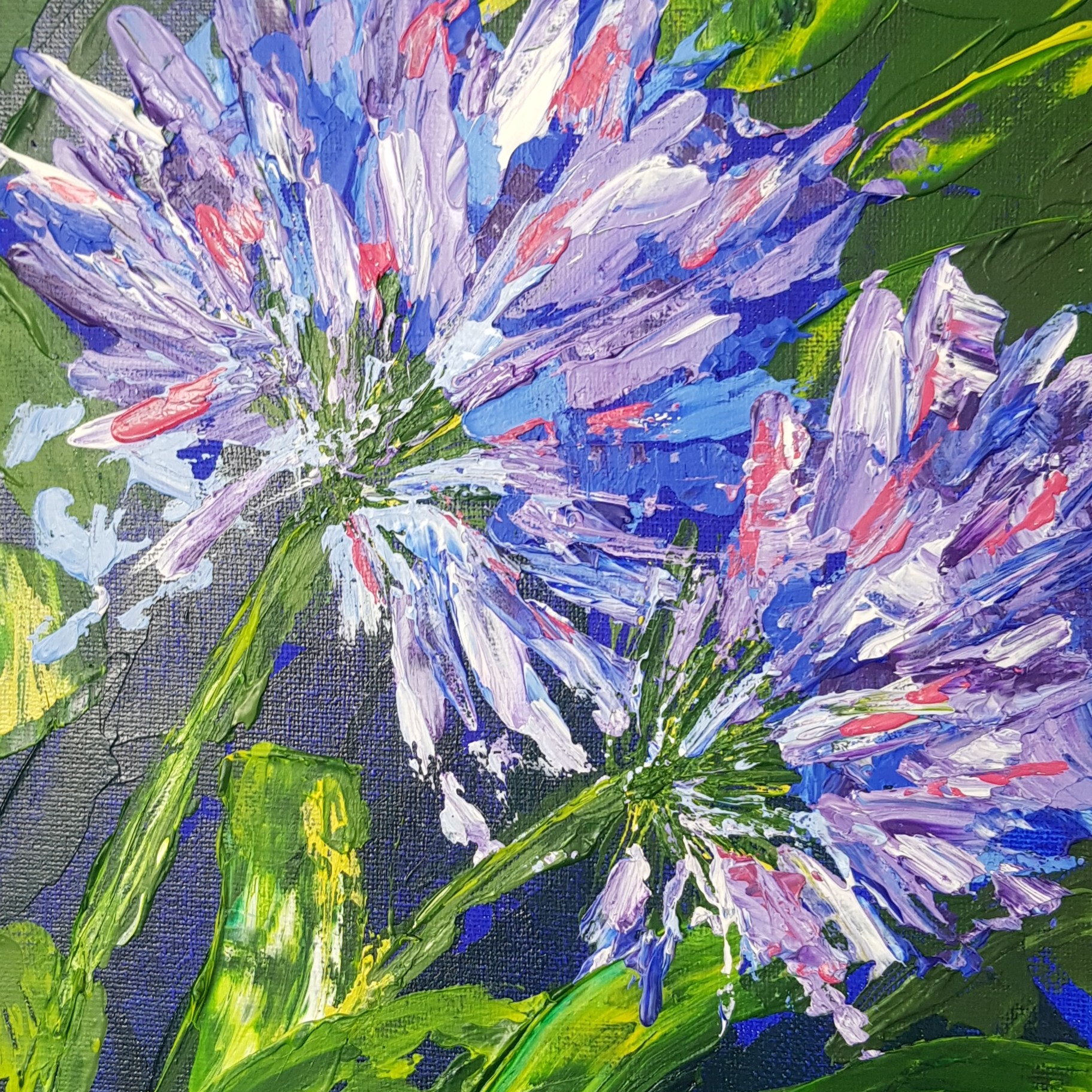 Since moving back home to St Lucia I have been approached to teach art. I never expected to be in a position where I would teach anything. I now find myself with a group of wonderful INTERESTED adult ladies and young lady who I teach. I am not sure they would all appreciate me posting photos of them with their work on my blog, so I decided it was safest not to. Rather I will just post an examples of some their amazing work from one of their art sessions. This particular morning my monthly group class painted a blue agapanthus with a palette knife. Prior to this none of them had any experience with paint, let alone a palette knife!