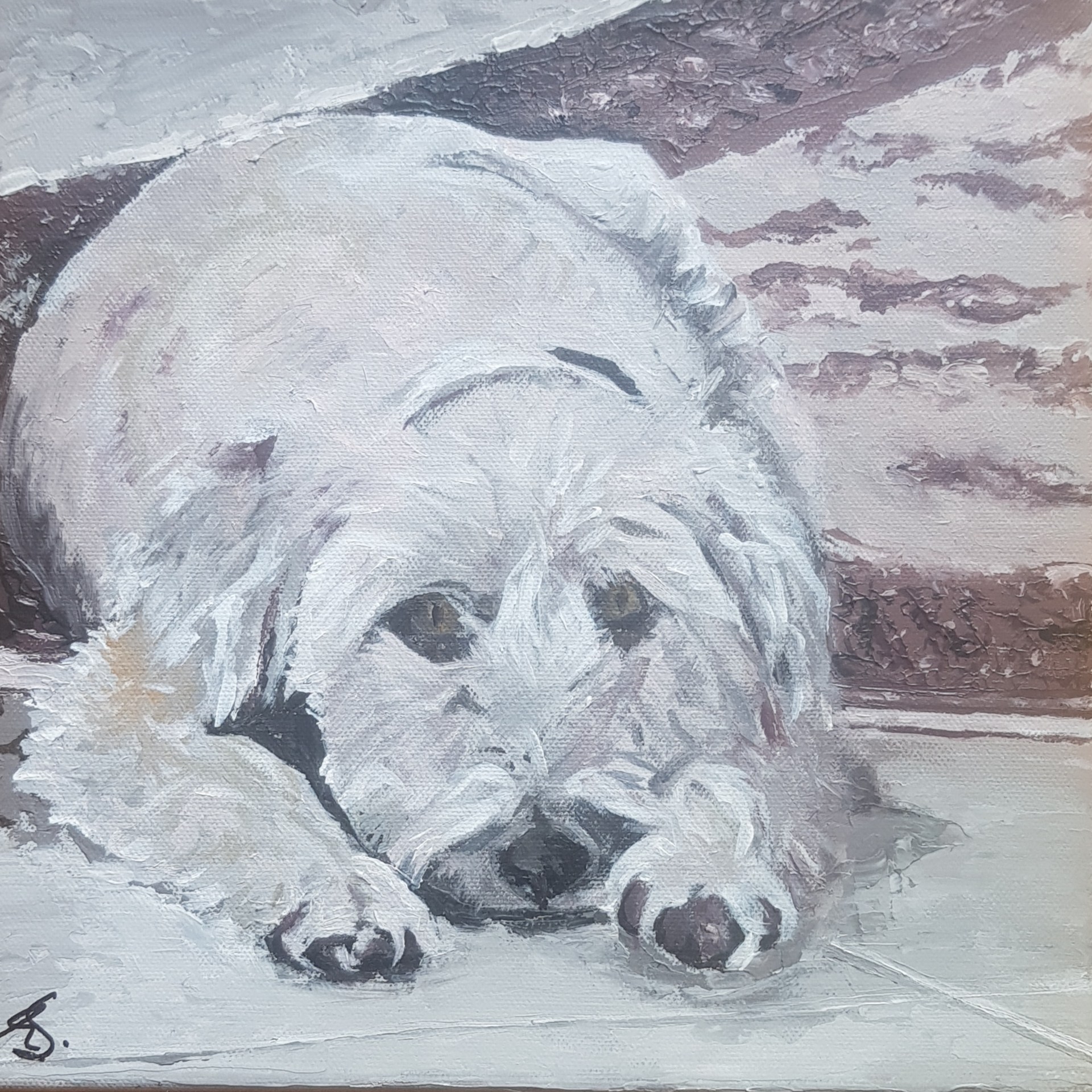 I also had an adult student who has sadly left the area who used to come for private lessons. She had painted before and had a good feel for colour and an eye for detail. We had such fun together, and she really pushed me way out of my comfort zone when she wanted to paint her dog in one of our lessons. I told her it would be a first for me too. I have been approached to paint pet portraits and I have avoided it as I didn’t know where to begin! Now I know and whats more…. I had fun, much to my surprise!