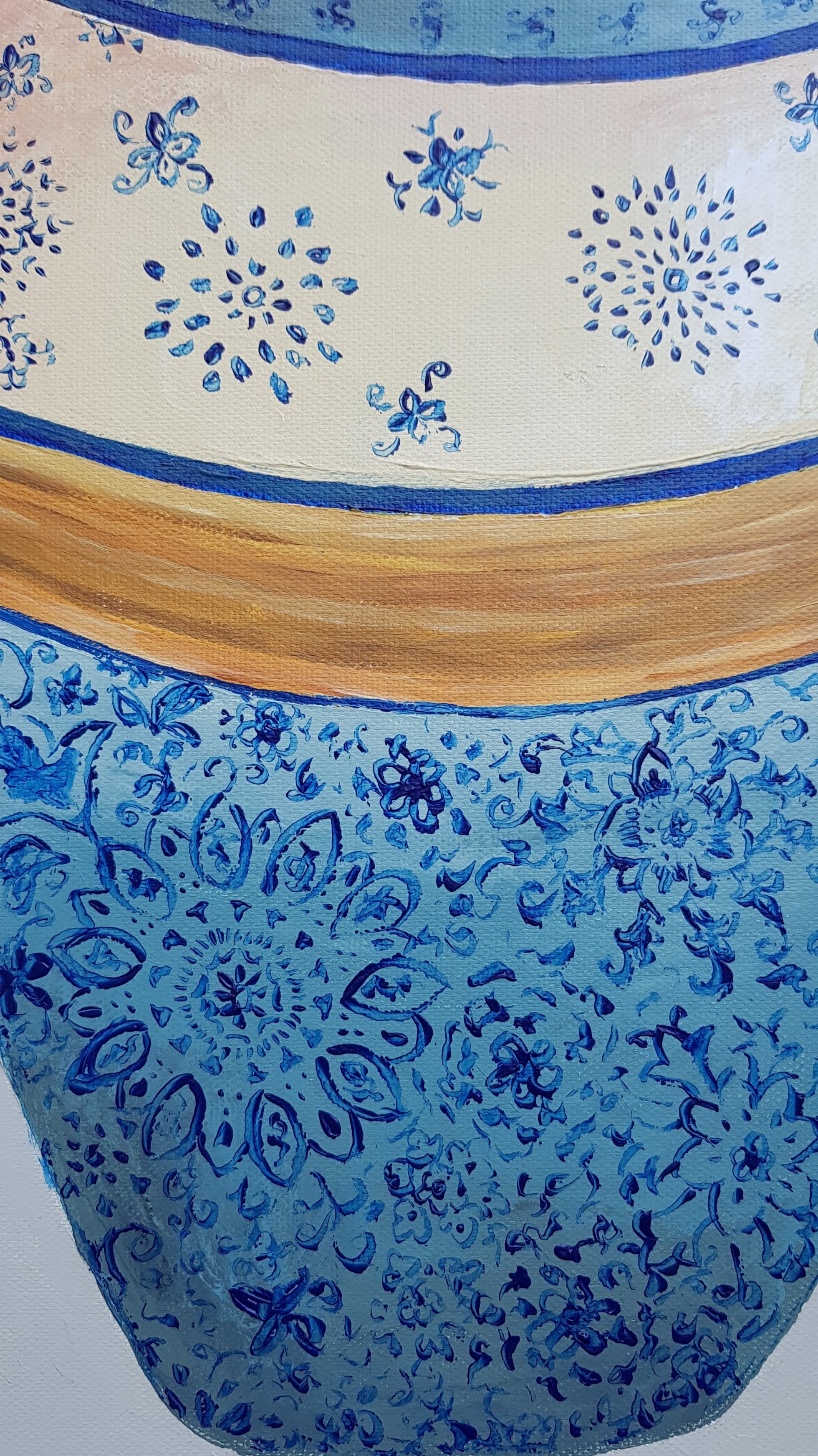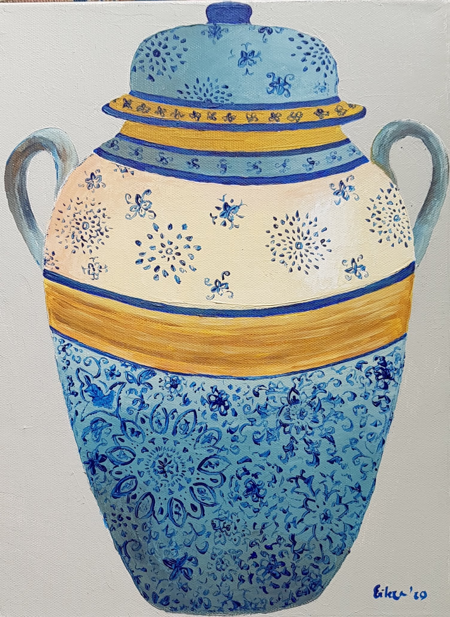 These were the photographs I was sent by the client. Definitely more Moroccan than Chinese ginger jar! The Kingdom of Morocco is renown for its pottery, covered with complex geometric, arabesques and beautiful, rich patterns. Moroccan art has been influenced by a diversity of cultures and Fez is the centre of their ceramic work. I don’t know if this is Moroccan, but the colours and shape of these two ceramic pieces scream Morocco to me.