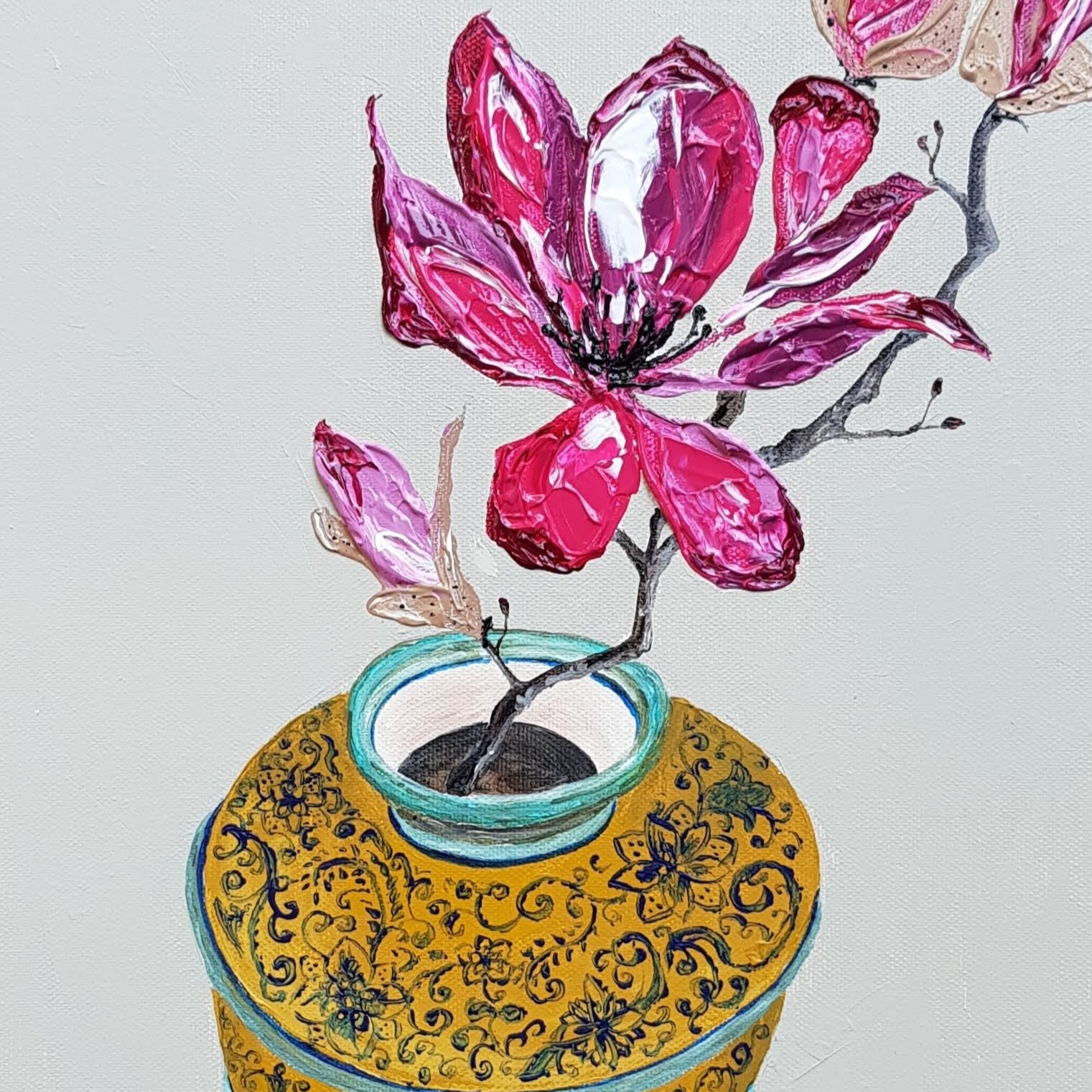 The other squat pot did not need to be “converted”, but the client wanted magnolias, or maybe Rhodesian flame tree flowers painted into them. The colour, shape and intricate decoration needed to be kept. The texture and size of the flowers would have worked, but I felt the creaminess of the magnolias would have had the potential to be too much of the same, with a possible insipid end result, which concerned me. The Rhodesian flame tree was a distinct possibility, but the rich raspberry colours of a tree tulip seemed more of an exciting fit with the mustard coloured pot, the phthalo blue design and turquoise trim.
