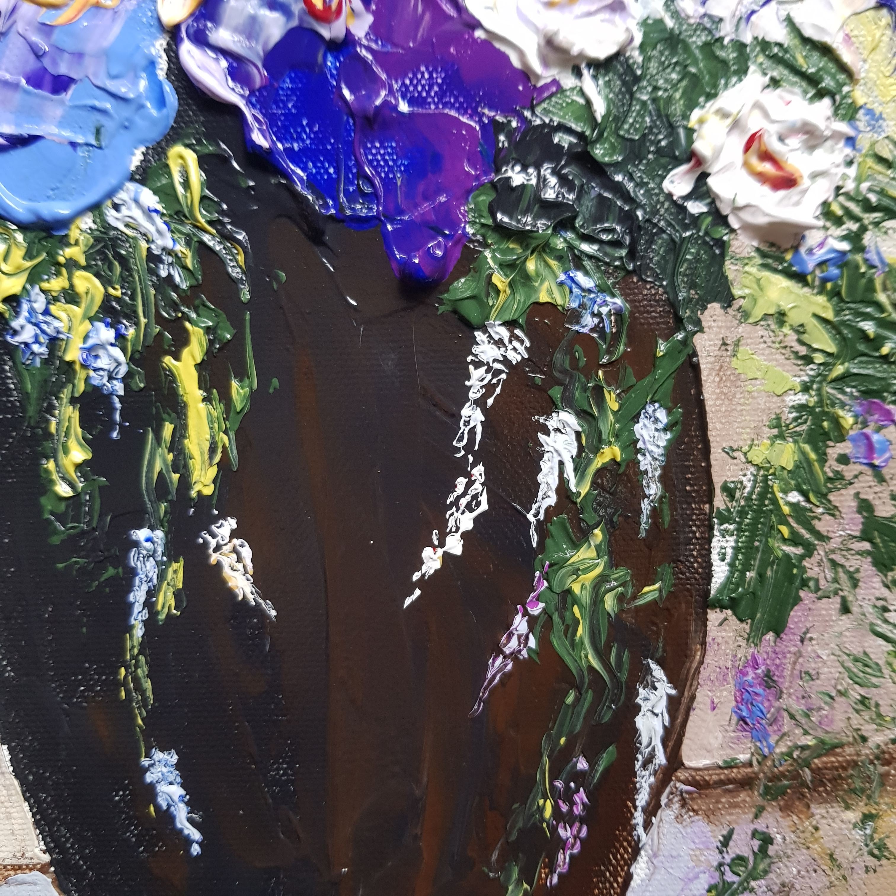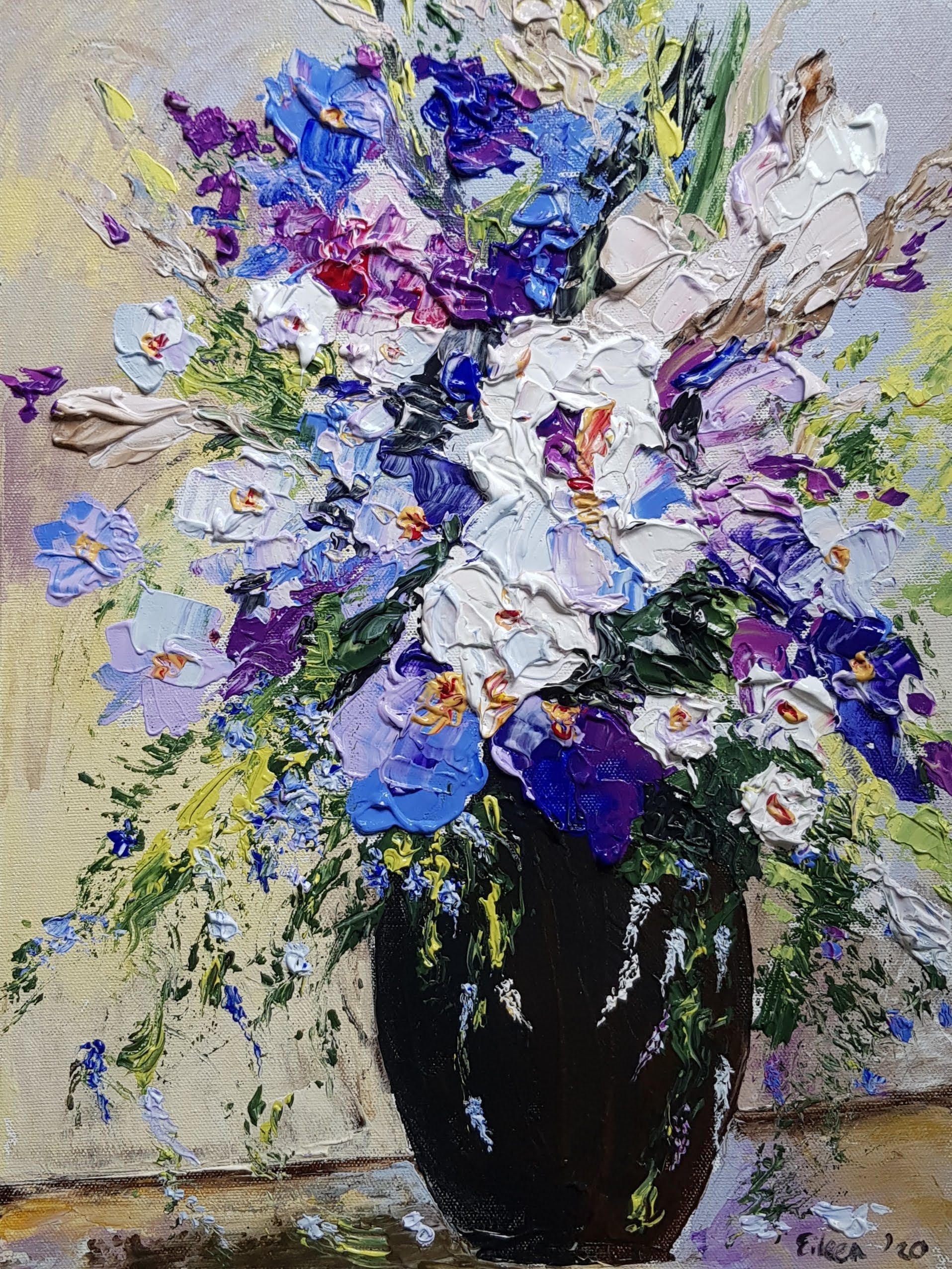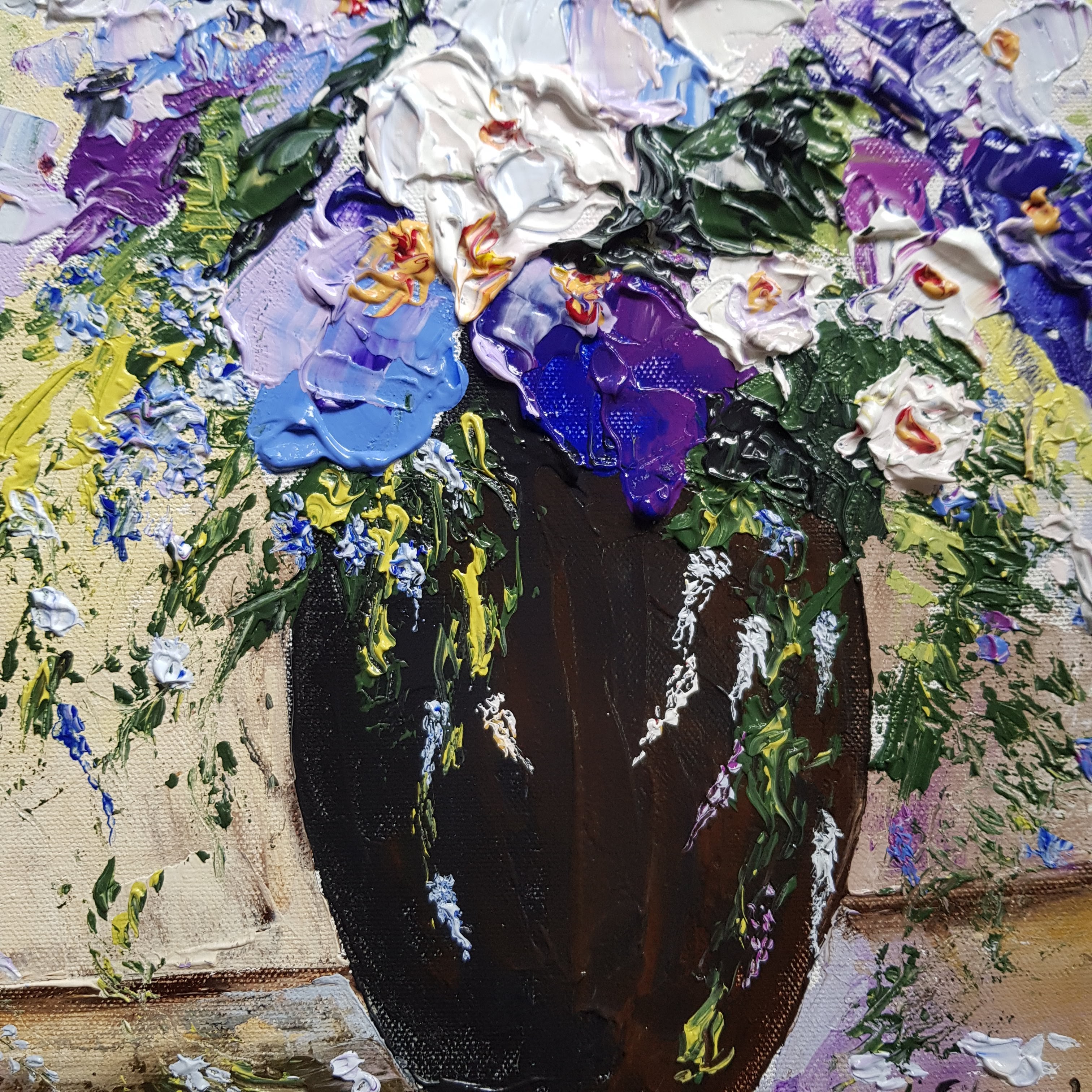 I wanted to create a bowl of flowers with a combination of delicate tendrils, and solid strong bold irises with rich purple centres, periwinkles and purple clematis. I used the black flower bowl my Mom has now given me that she always arranged her hydrangeas in as the vessel for this arrangement