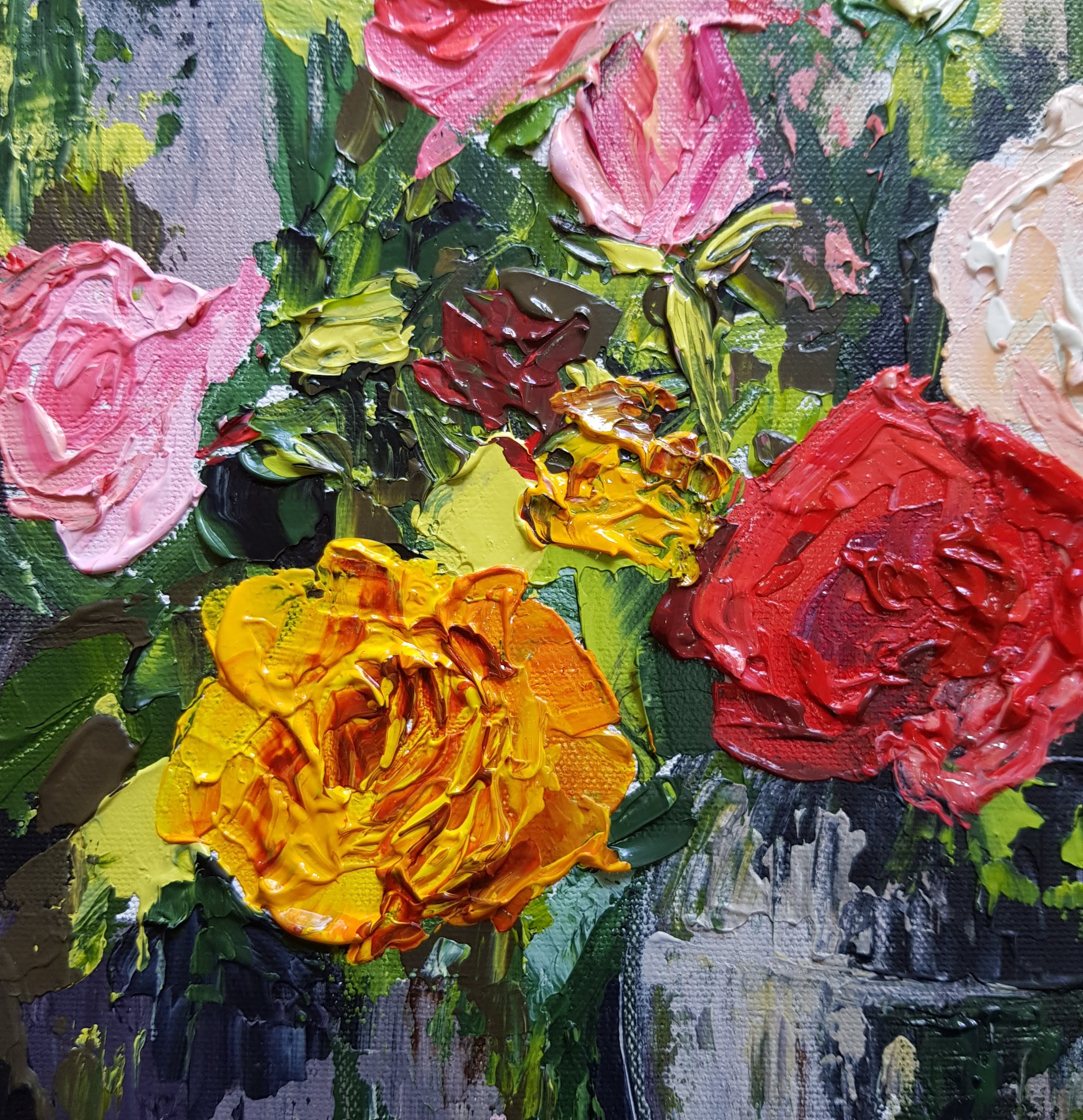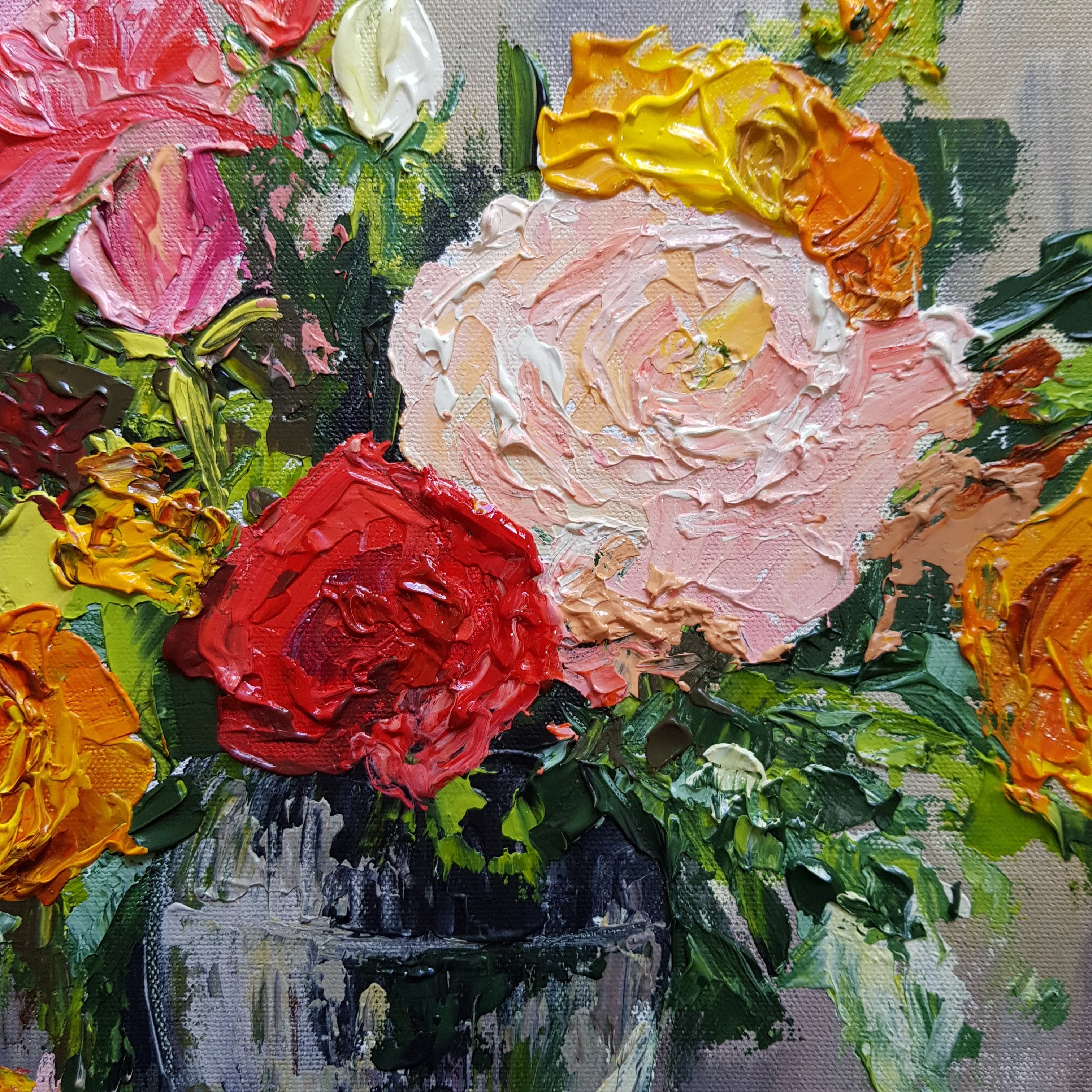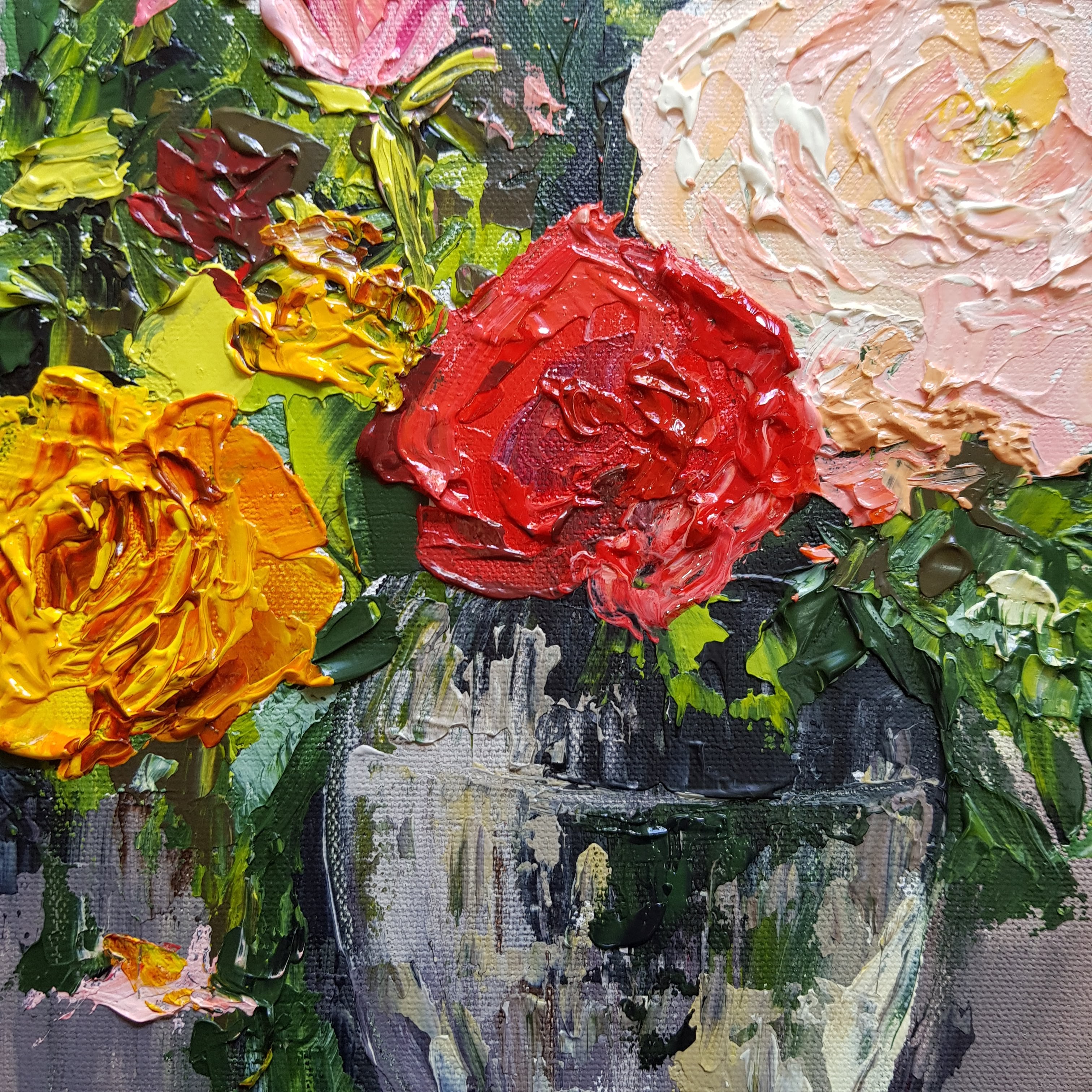 Thick impasto style paint applied with a palette knife creating depth and texture.