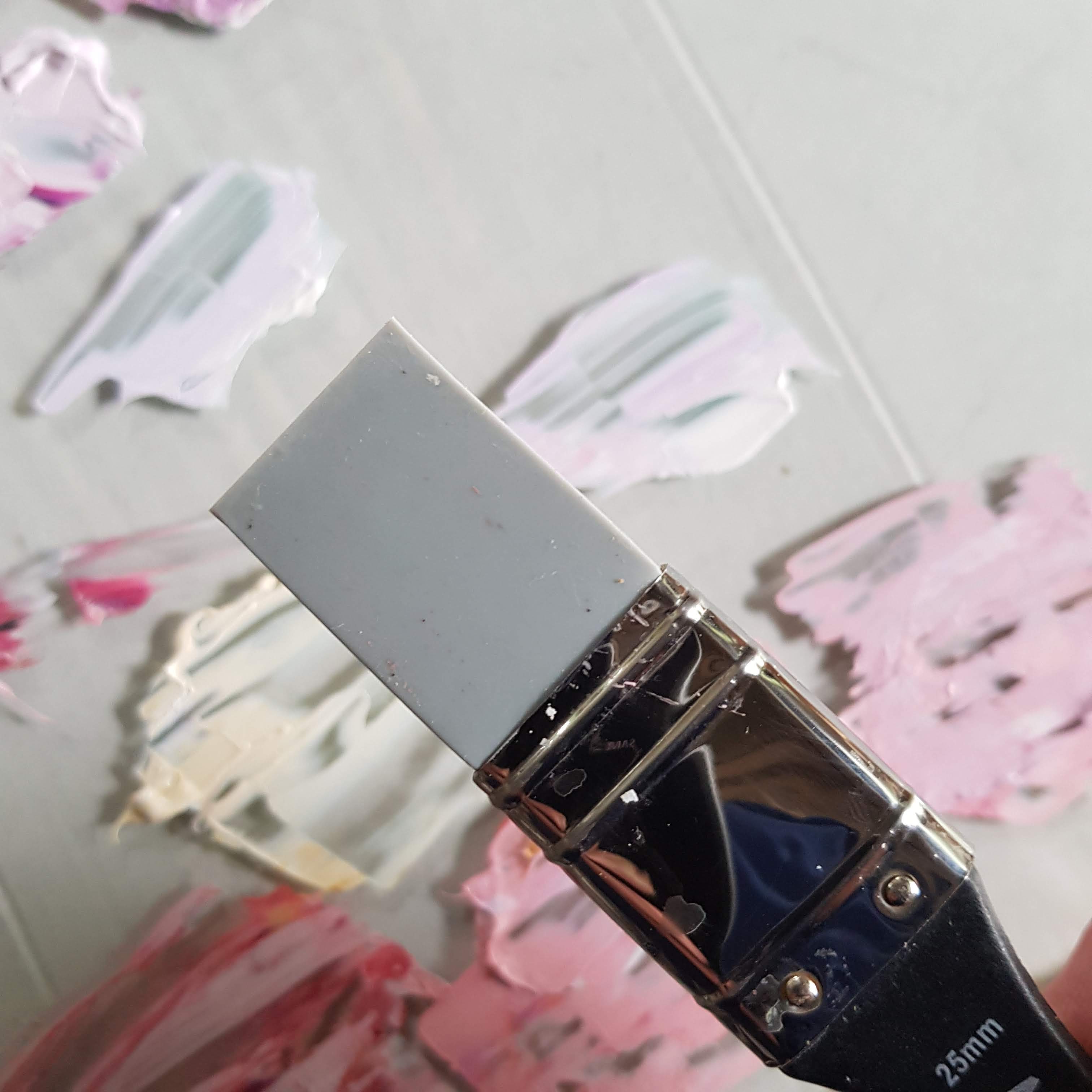 It is not quite a brush, and not quite a palette knife and has a stiff yet flexible applicator. It is crafted from flexible silicone to allow for expressive versatility. There are two styles: The wedge where the edges are ergonomically designed to fit in your hand allowing for a more direct interaction with your work. I find this particular tool a lot less flexible than the silicone blade. The blades are mounted on brush handles offering a blend of the old traditional style of brush, but with a silicone wedge instead of bristles.