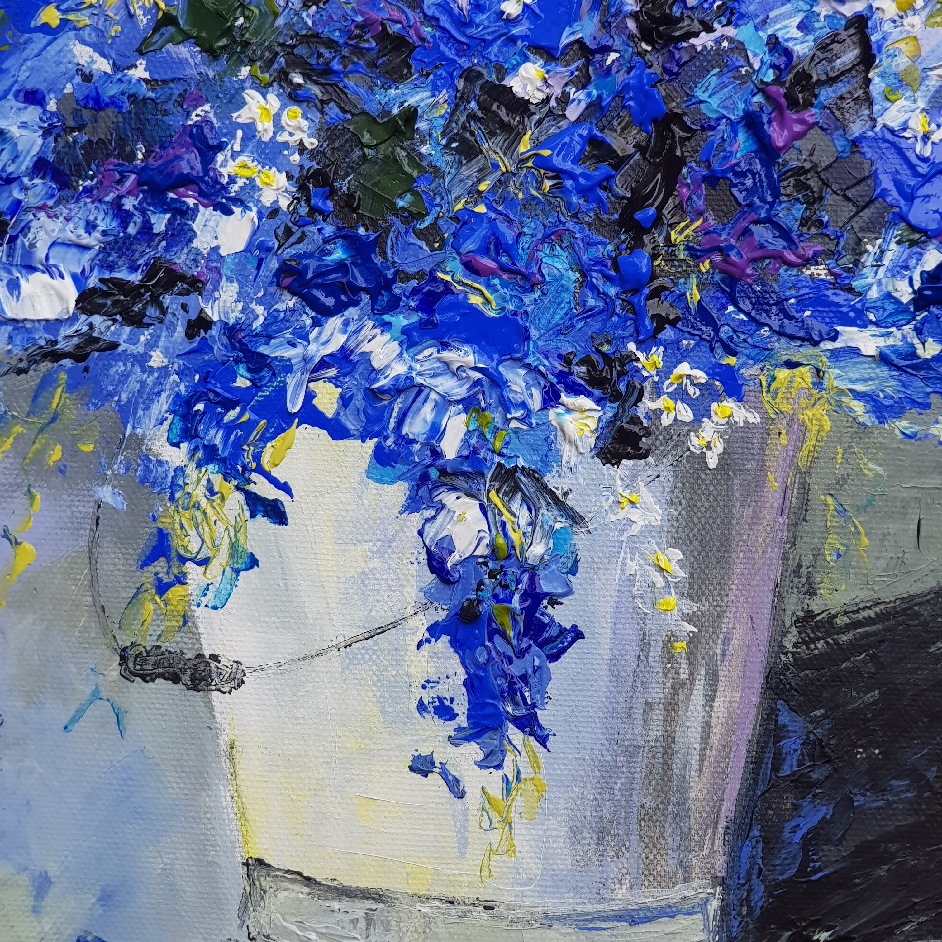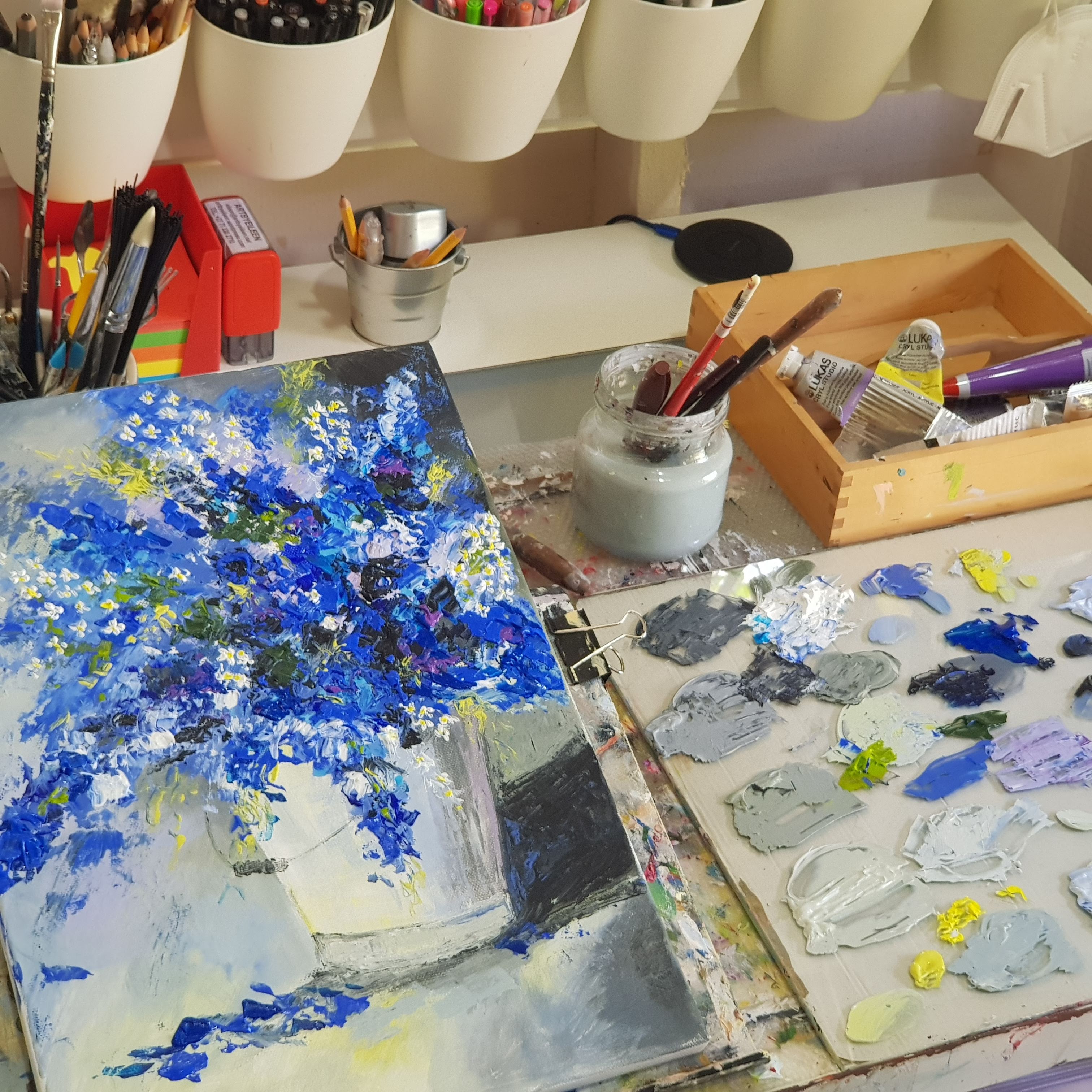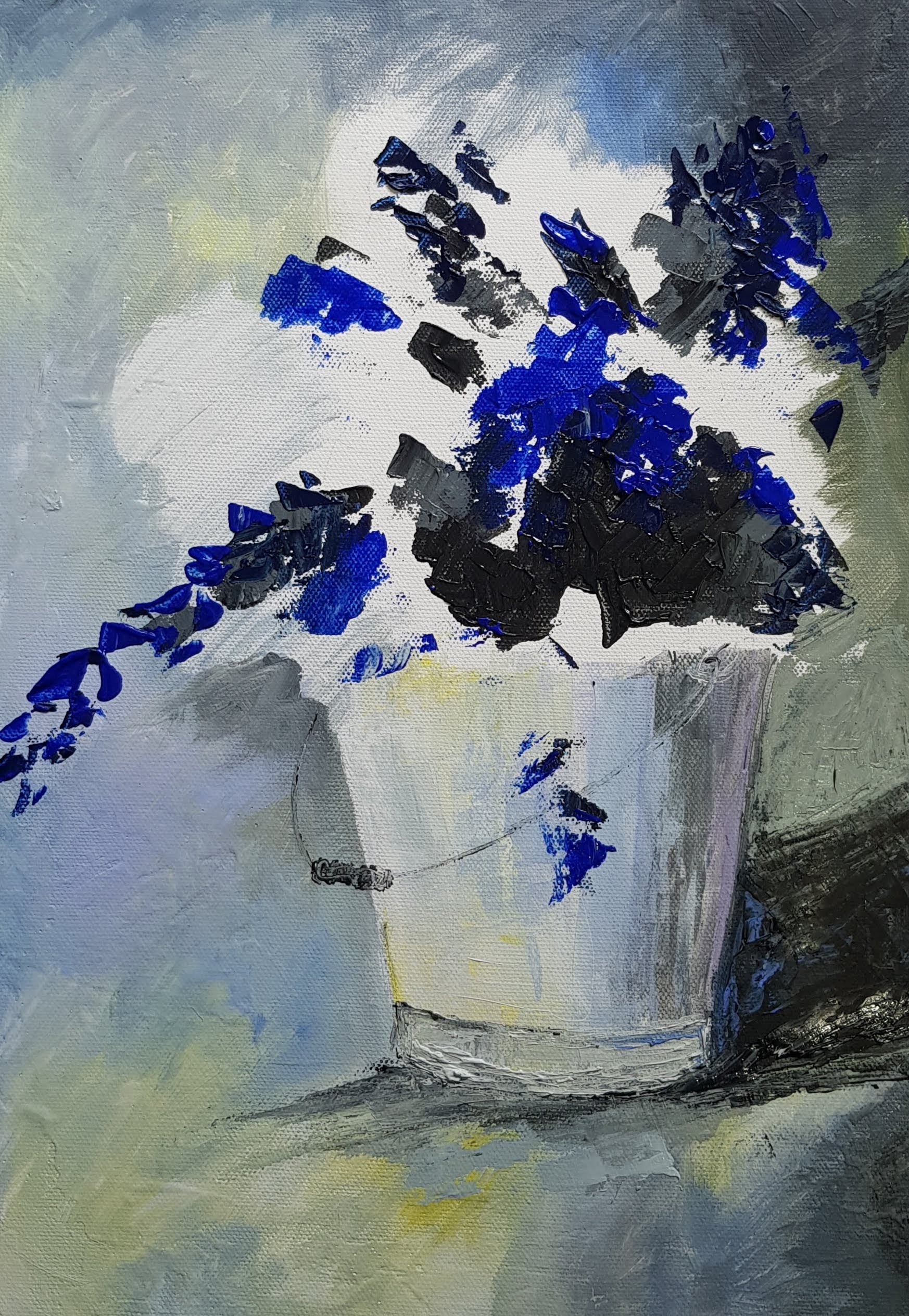 Once the background and bucket had been mapped out, the darker shadow areas, and brighter blue splashes of colour were laid down to be followed with the different shades of blue and white and lilac, and finally a few splashes of green for the leaves, and bizmuth yellow for the flower centres.