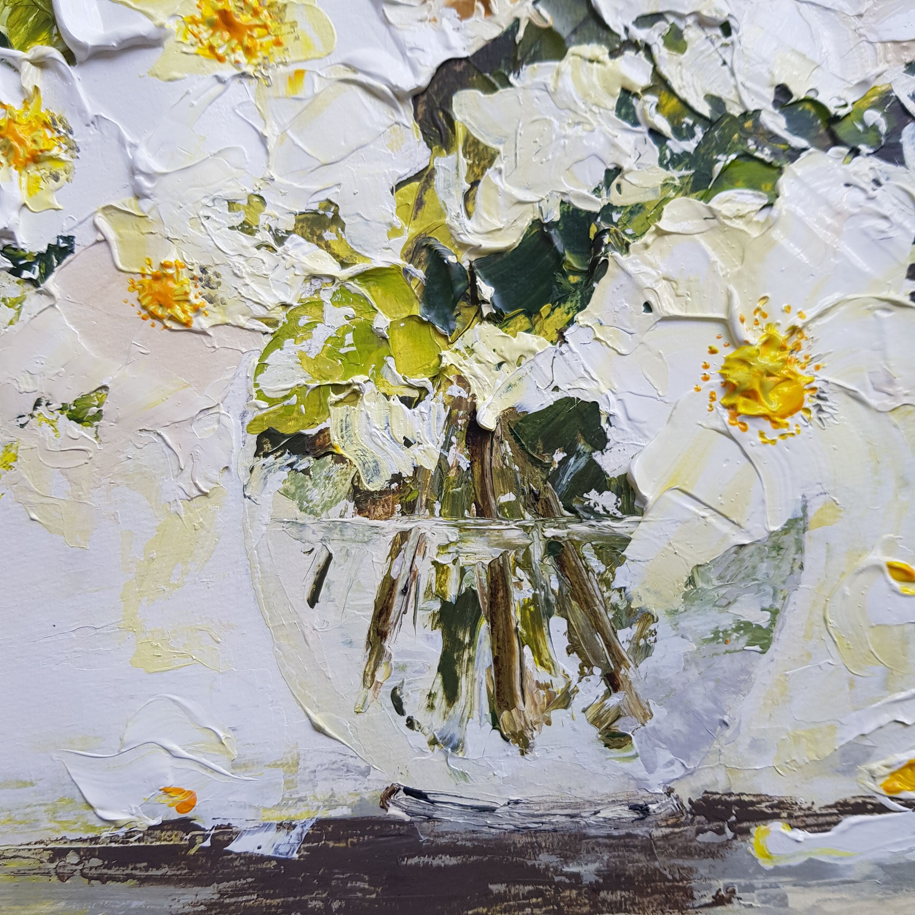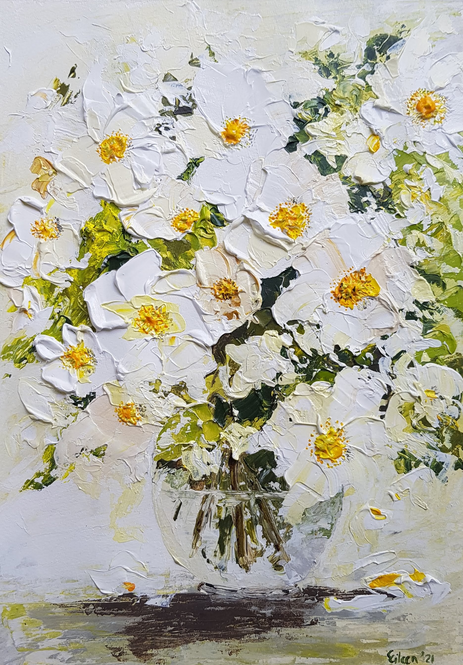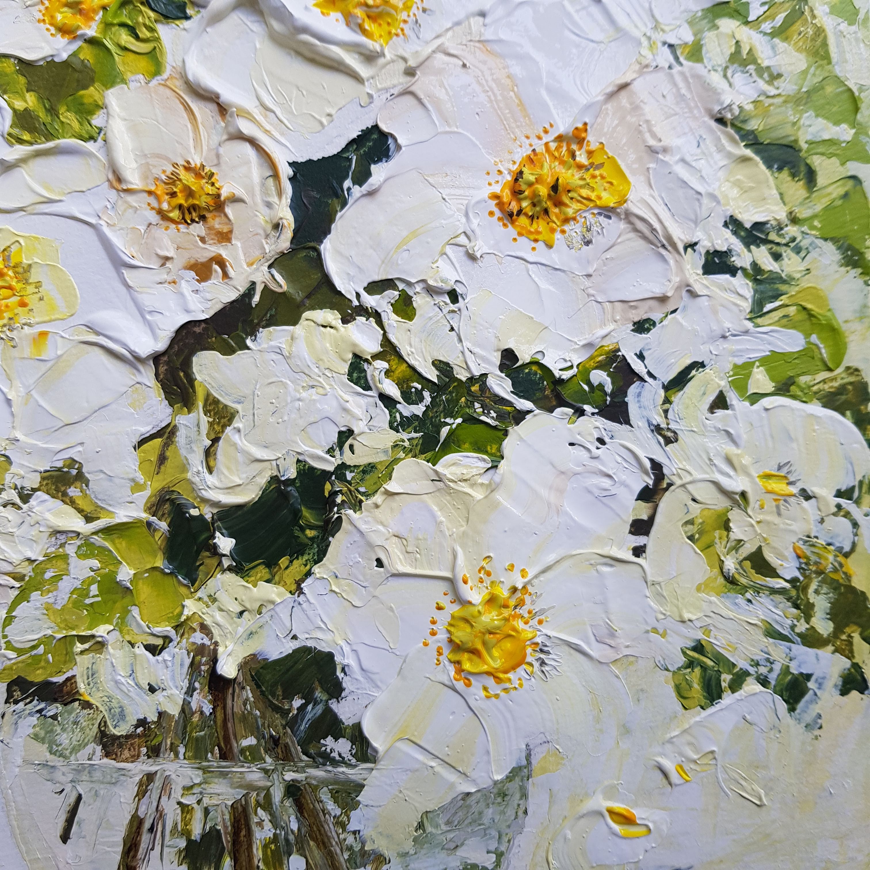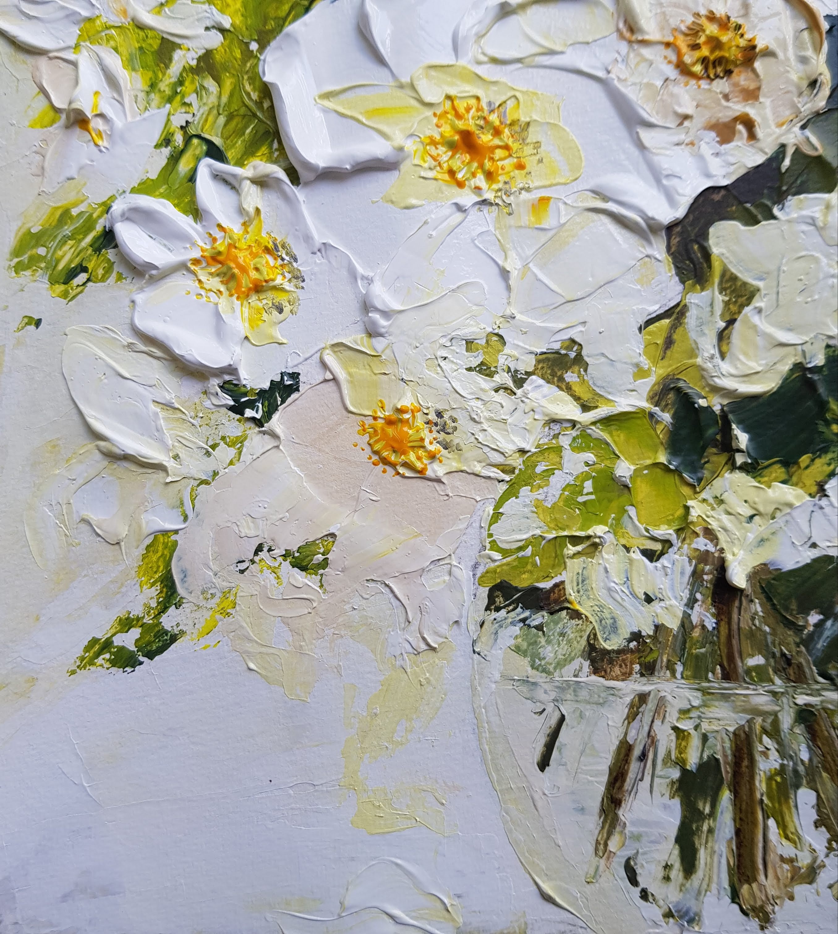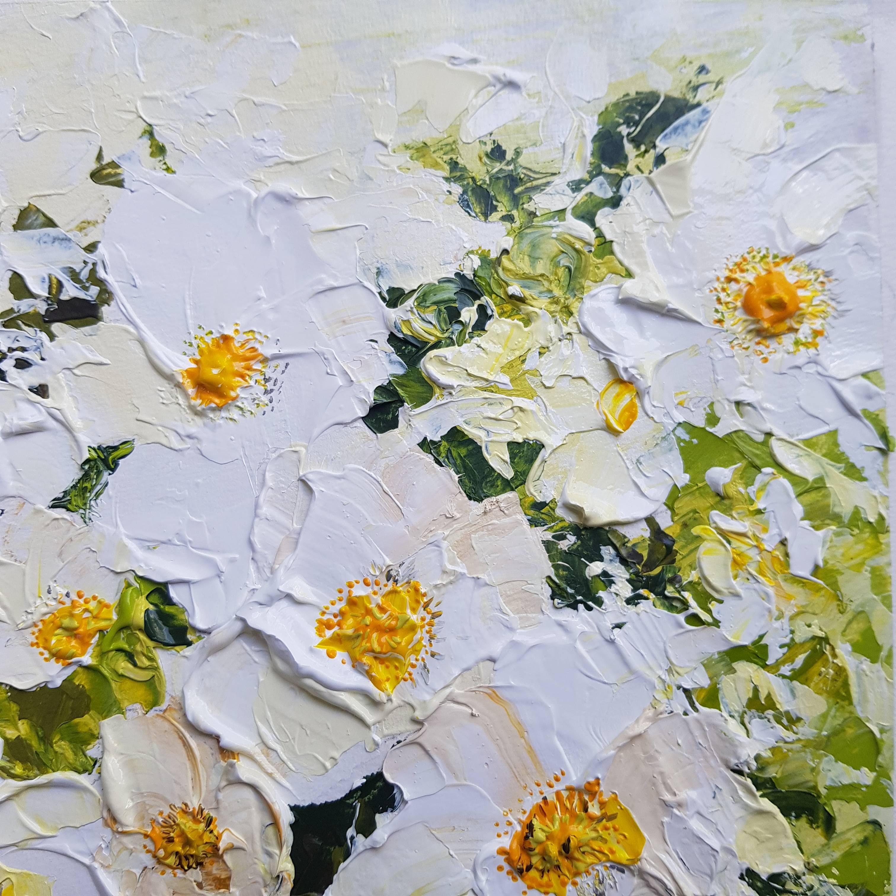 The application of paint is thick and textured, and alludes to the shape of the bramble rose rather than being realistically accurate.