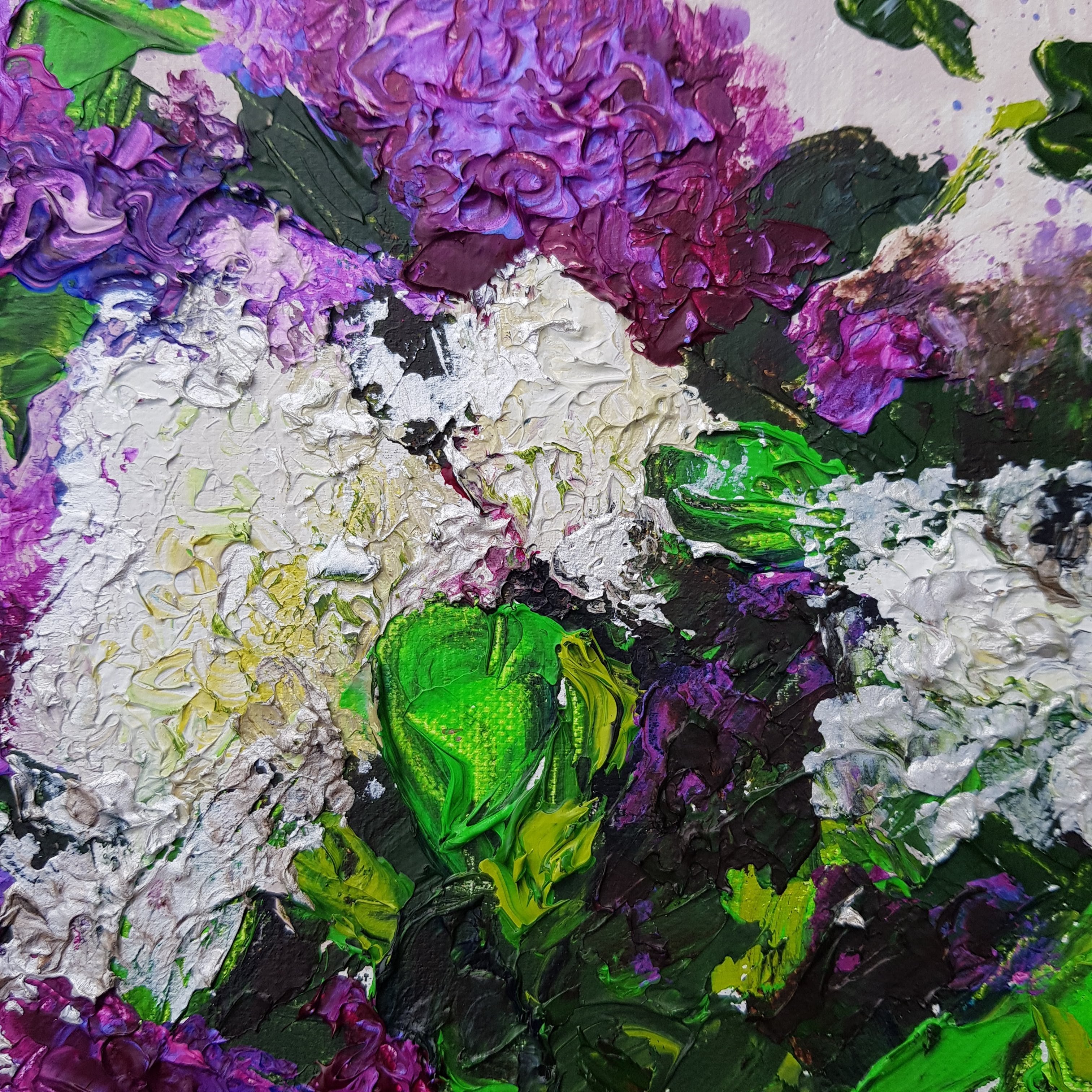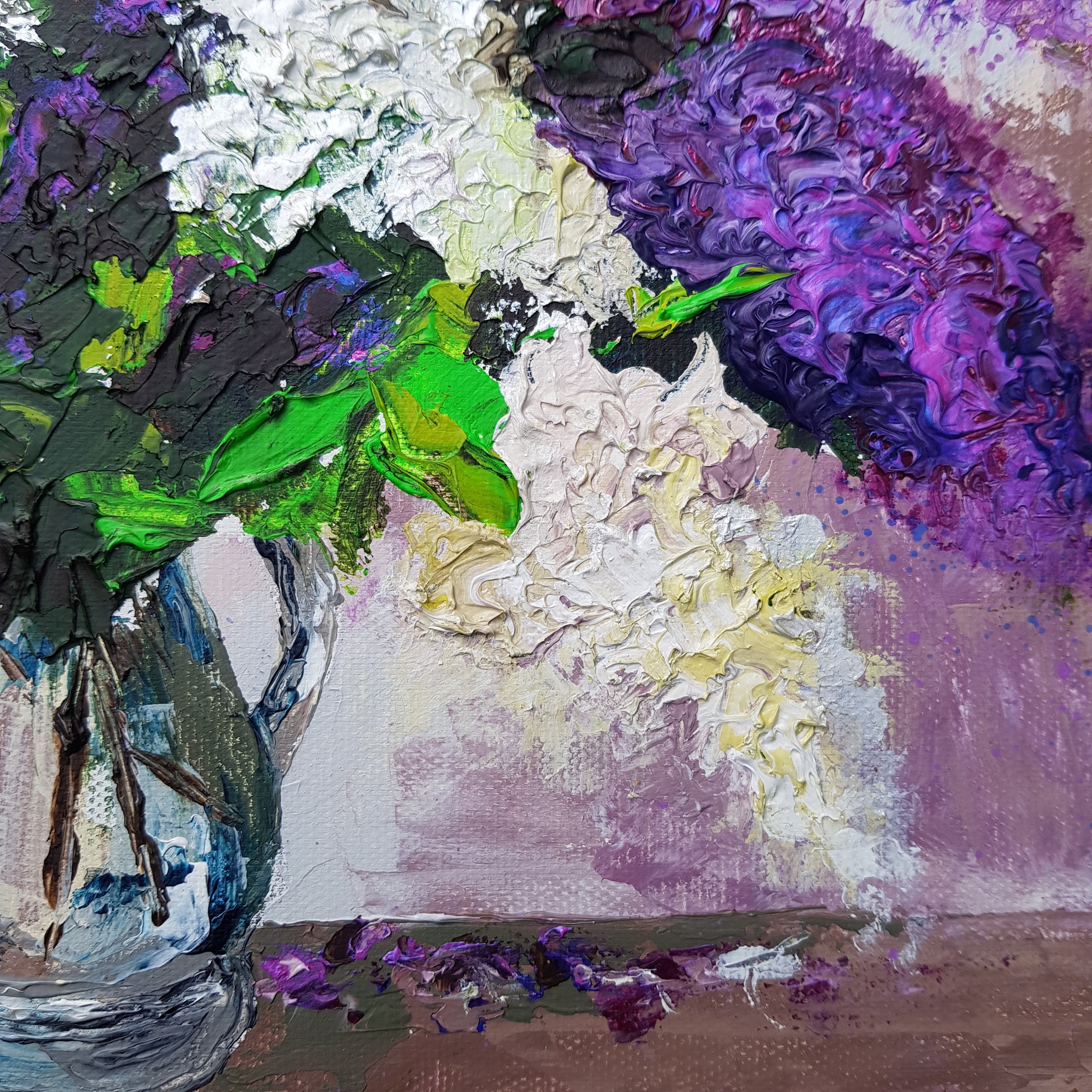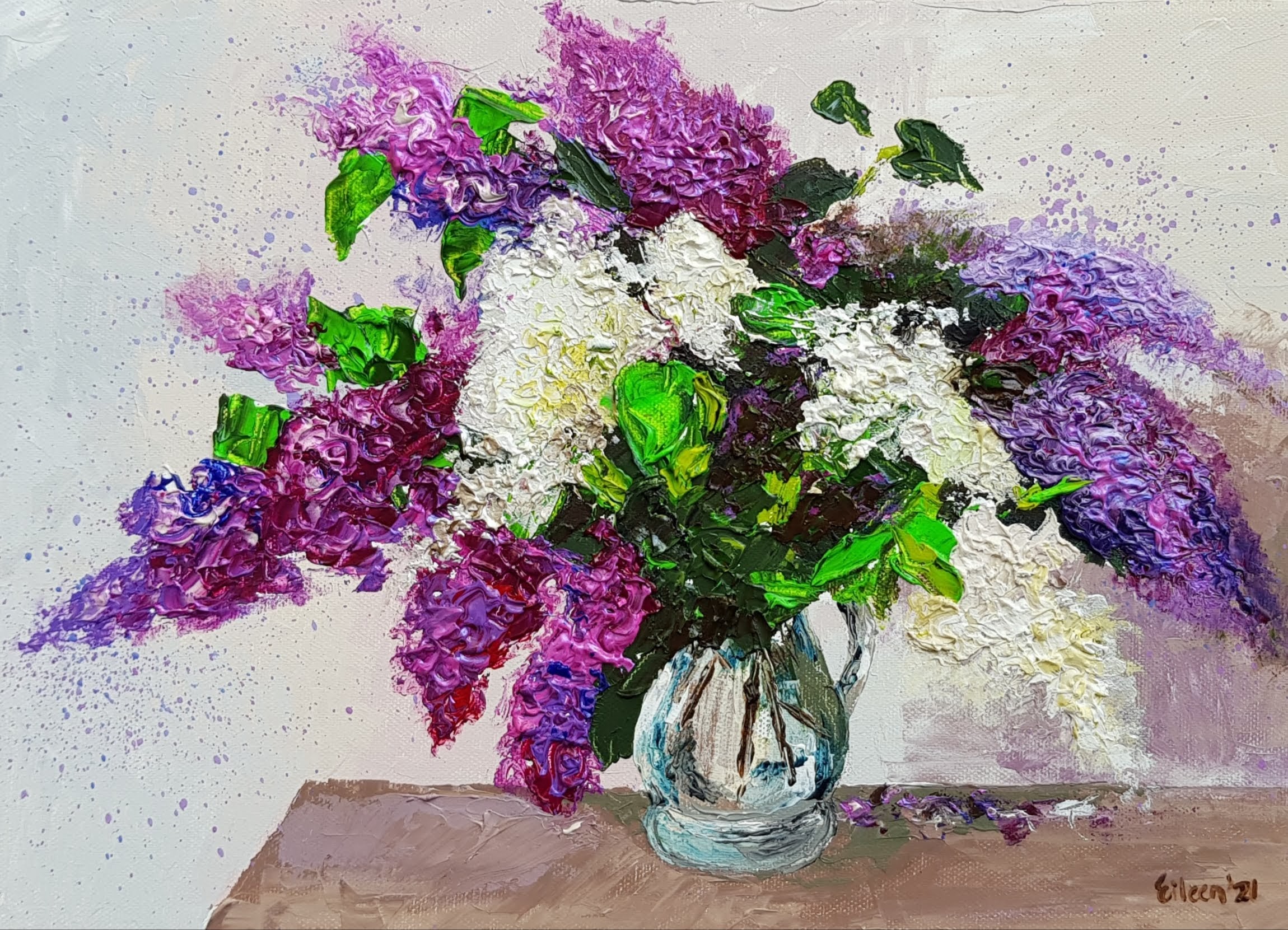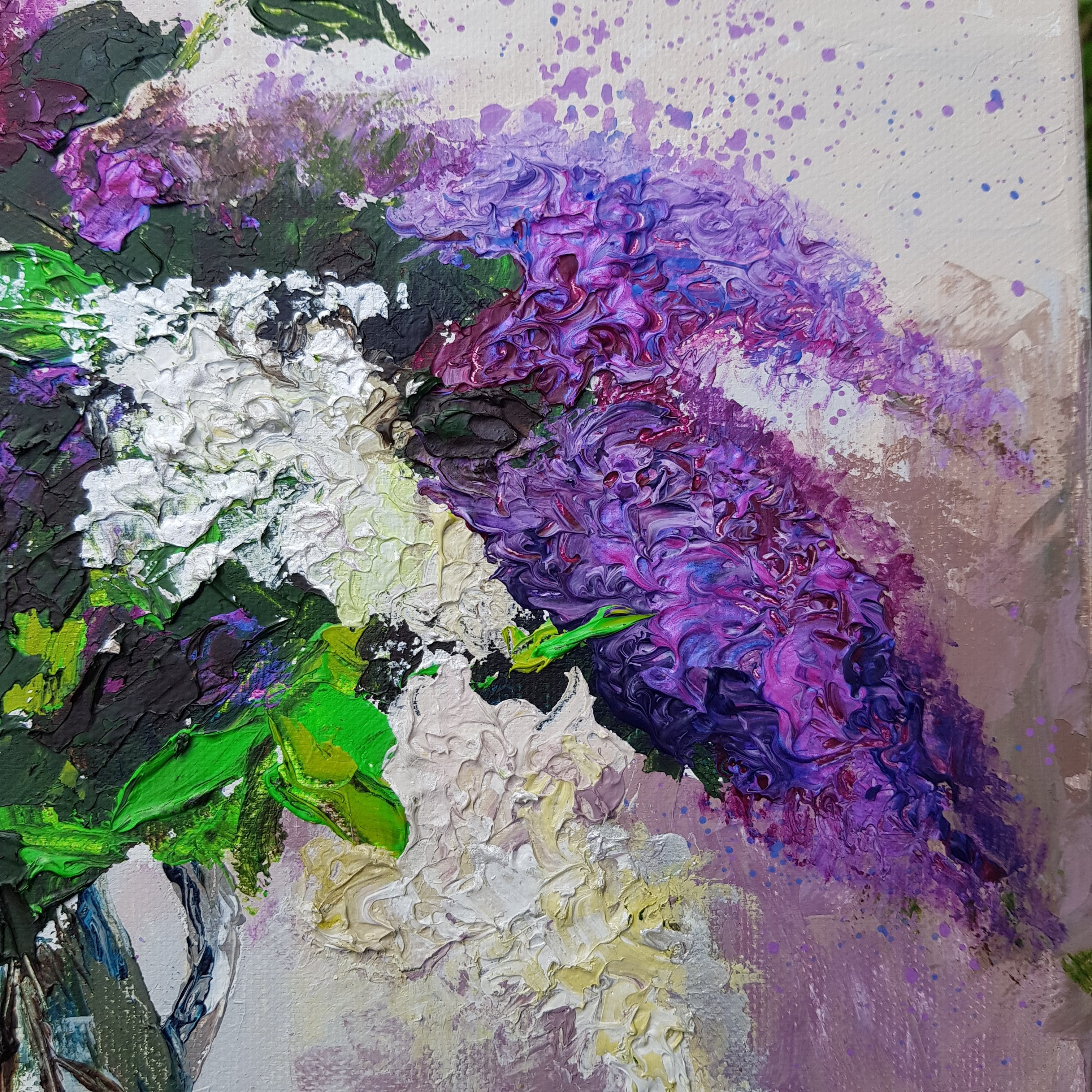 I love lilacs for so many reasons, their beautiful blooms, their exquisitely pungent perfume, and most of all their colour. I was trying to think of all the colour names that come to mind when painting lilacs….