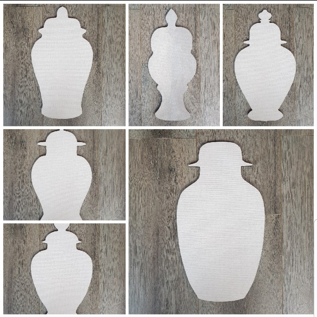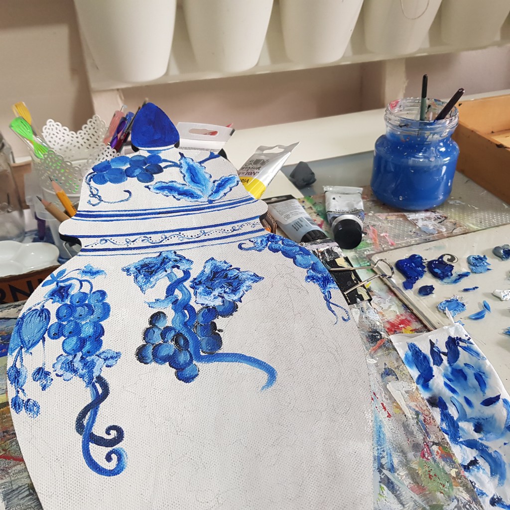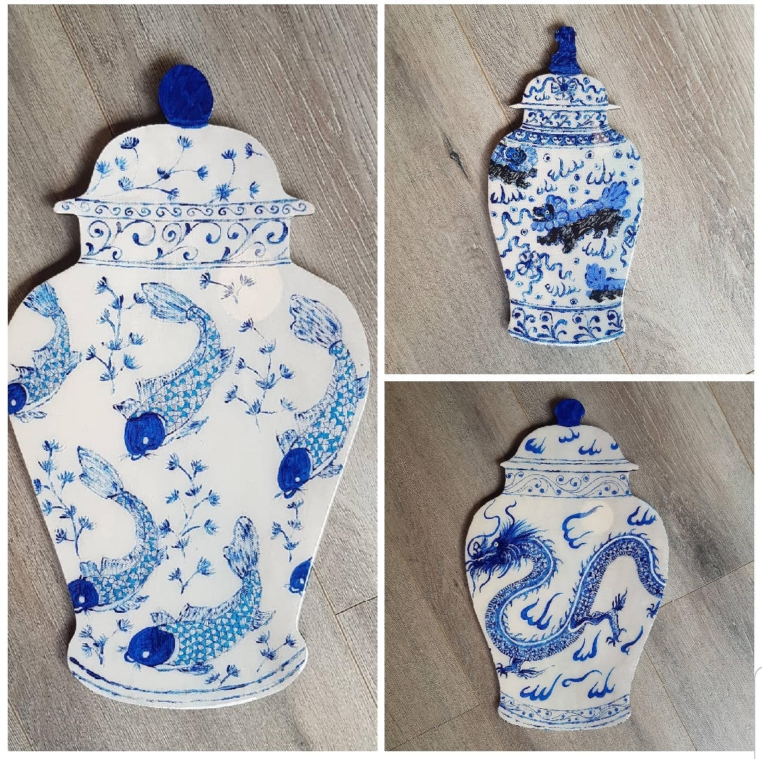 One evening watching an interior design programme on television I noticed one of the houses had beautiful ceramic flatware (for want of a better description) in circular shapes with a chinoiserie design on hanging on a wall in the kitchen. It got me thinking. I am not a potter so how could I create something similar, and that was how I came up with the idea of MDF ginger jar cut-outs. The MDF has canvas glued to the one side and then that surface is painted to look like a ceramic surface. Once dry the chinoiserie design is created.
