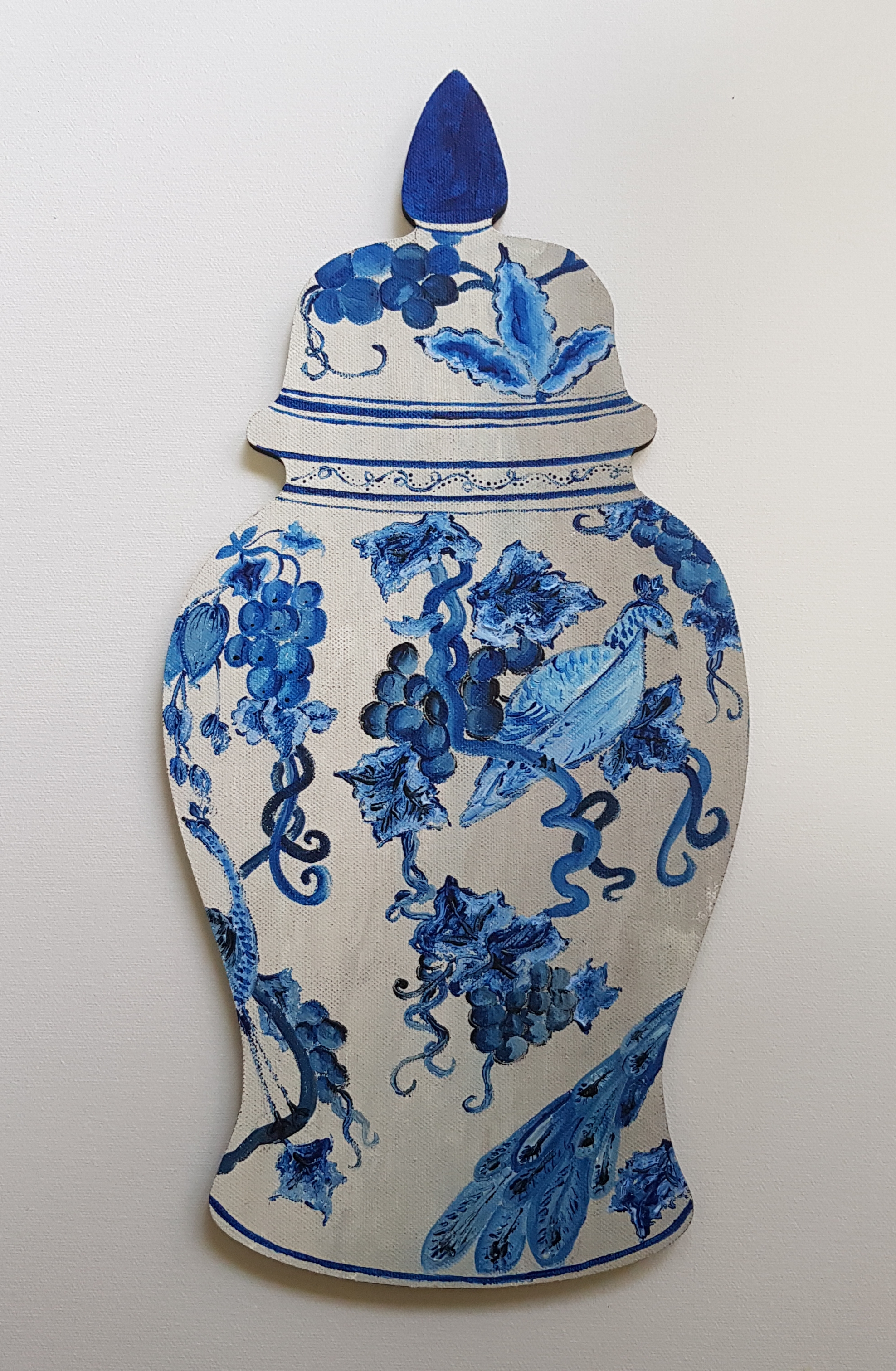 One evening watching an interior design programme on television I noticed one of the houses had beautiful ceramic flatware (for want of a better description) in circular shapes with a chinoiserie design on hanging on a wall in the kitchen. It got me thinking. I am not a potter so how could I create something similar, and that was how I came up with the idea of MDF ginger jar cut-outs. The MDF has canvas glued to the one side and then that surface is painted to look like a ceramic surface. Once dry the chinoiserie design is created.