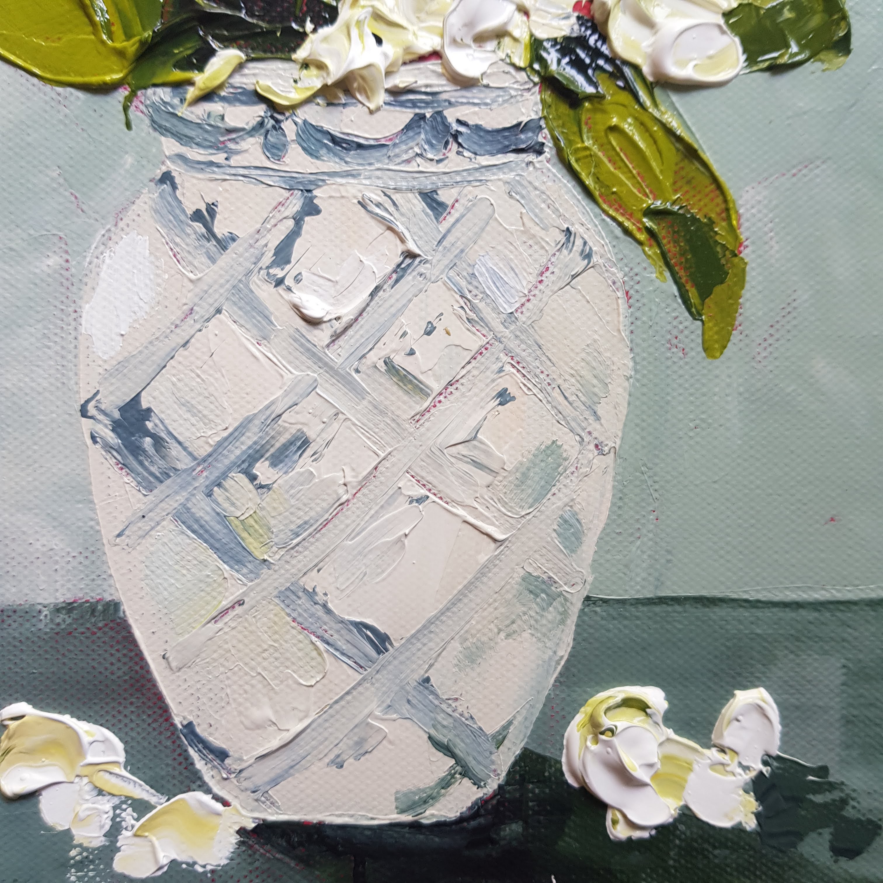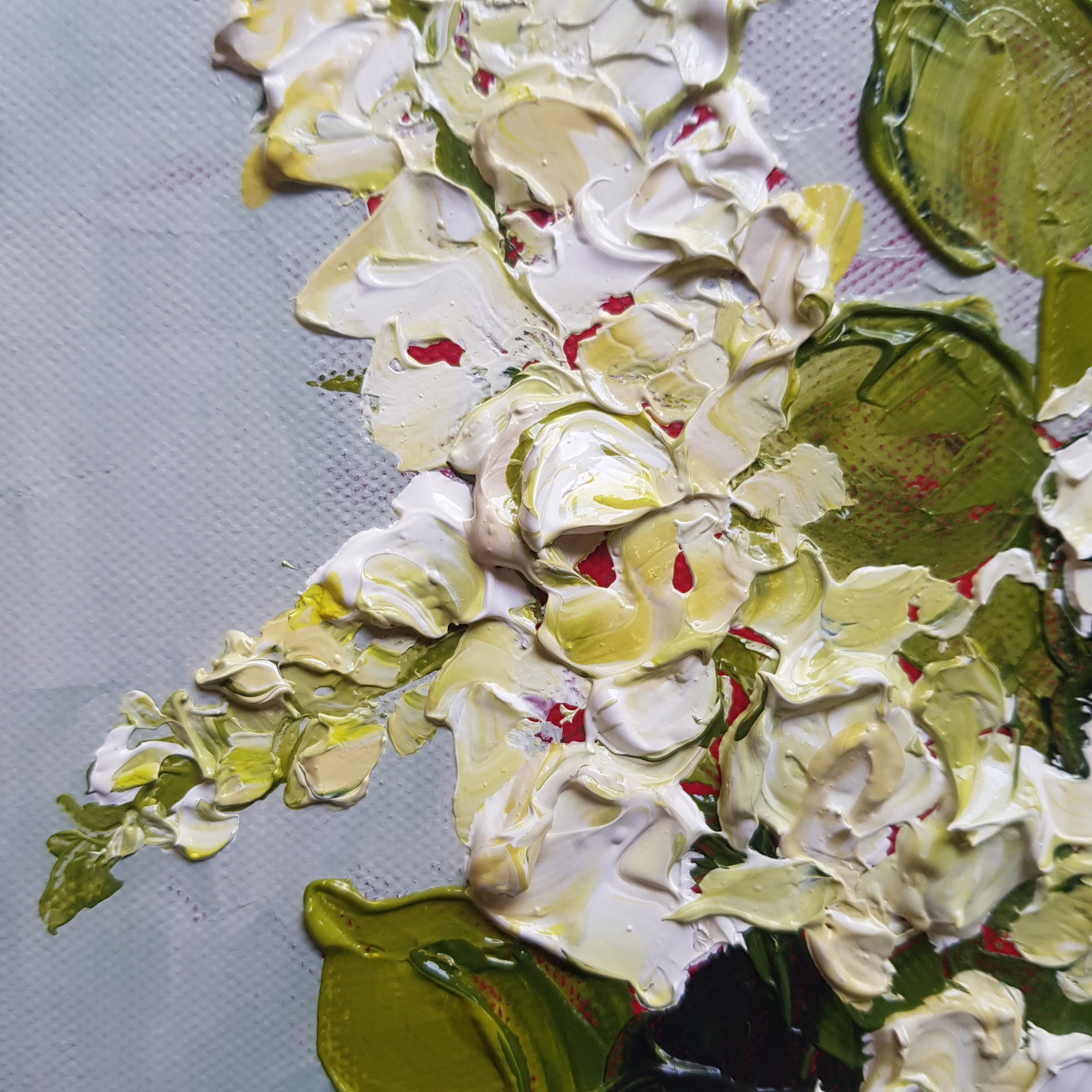 I love the gloopy dollops of paint that create the look of a snapdragon. I use a palette knife with a narrow flat end to create the shape of the snapdragon. I premix shades of white and a soft green yellow, which I then collect on the tip of the palette knife and smear on to the canvas to build the shape of the snapdragon flower.