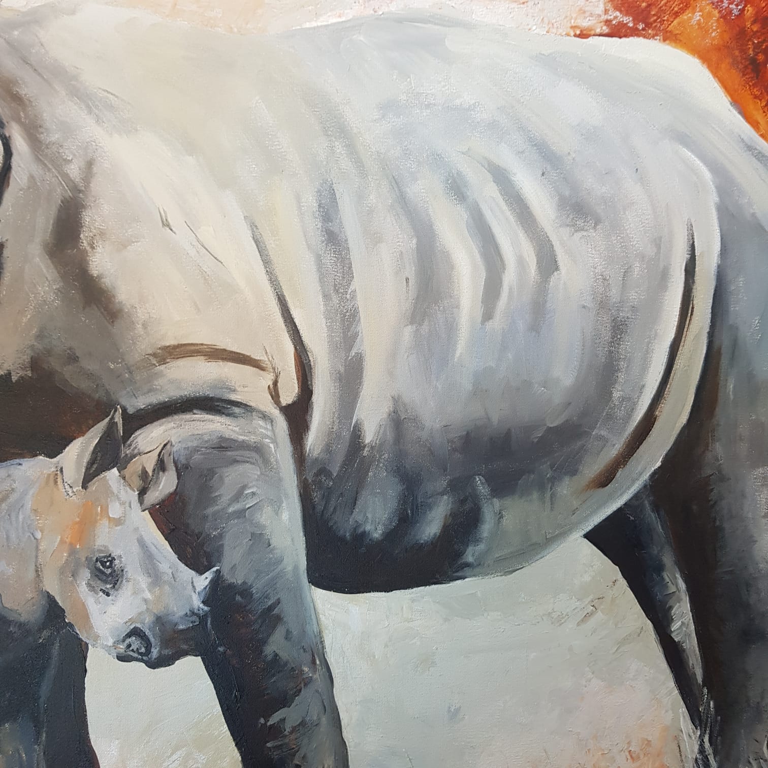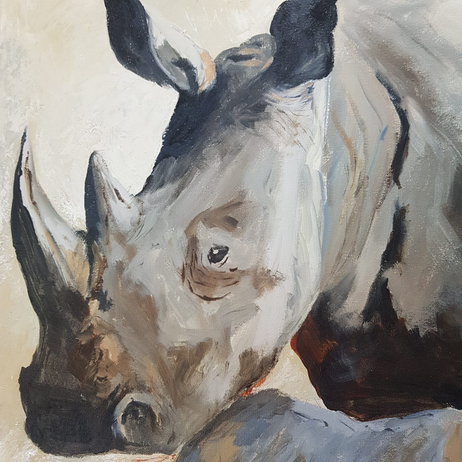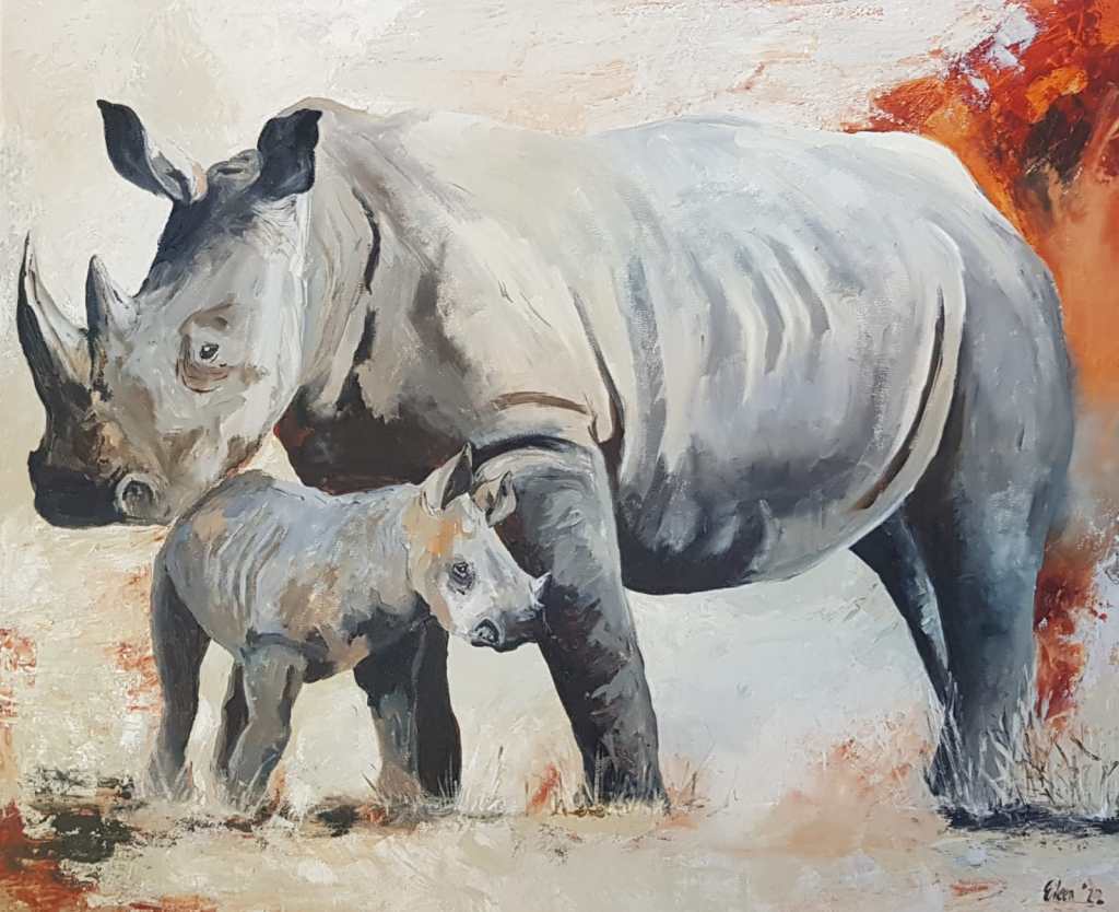Painting rhinos will always be a passion. I was recently commissioned to paint a mother and baby white rhino that once finished would fly to its forever home in Munich, Germany. The colours were specified and the size was 120 cm X 100 cm to fit a large empty wall in the clients living room.