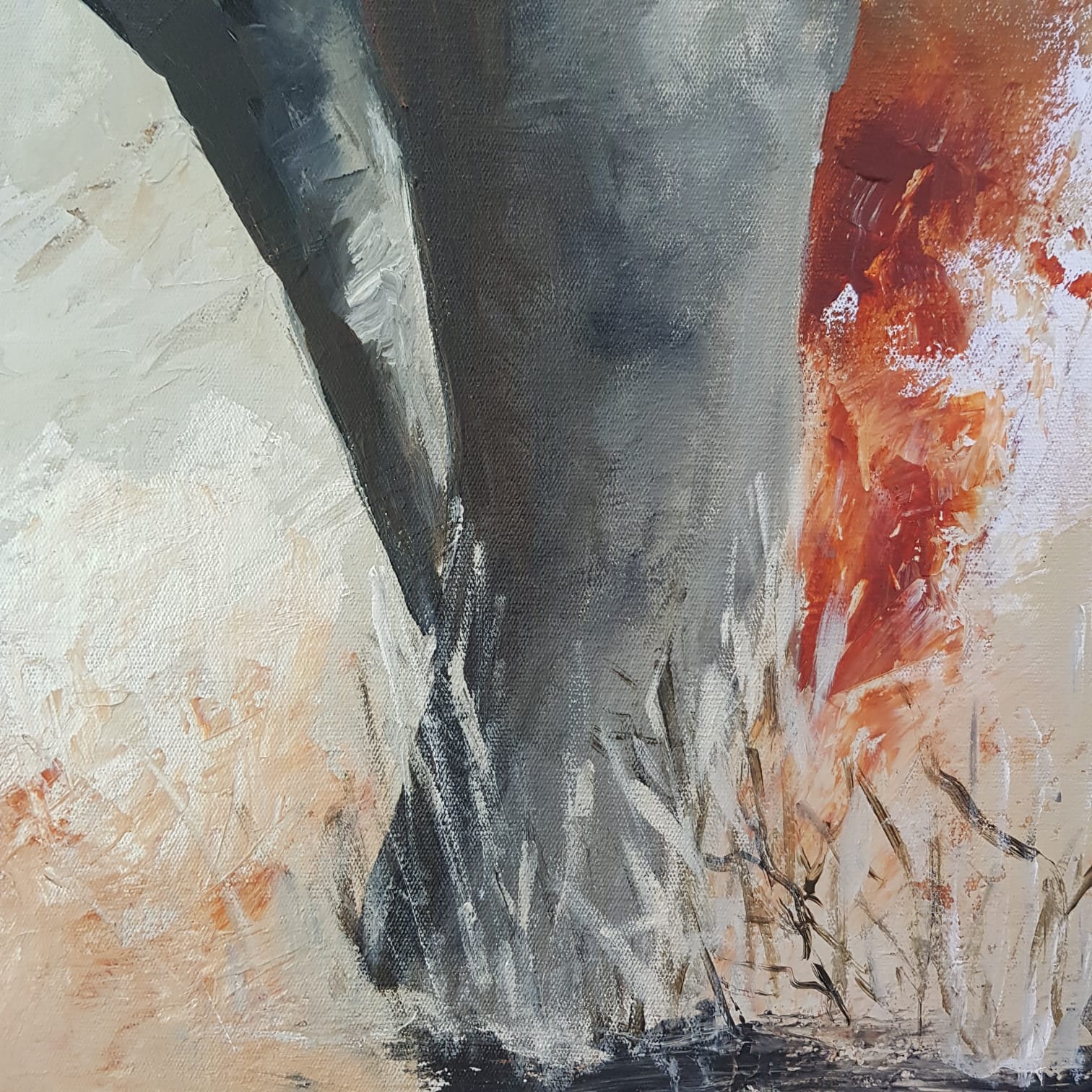Once the bulk of the background was completed I focussed on painting the rhinos with a large wide brush and a limited palette of a custom black created with Ultramarine Blue and Burnt Umber, N3 & N2 Grey, Paynes Grey, Burnt Sienna, White, Buff Titanium and Naples Yellow.