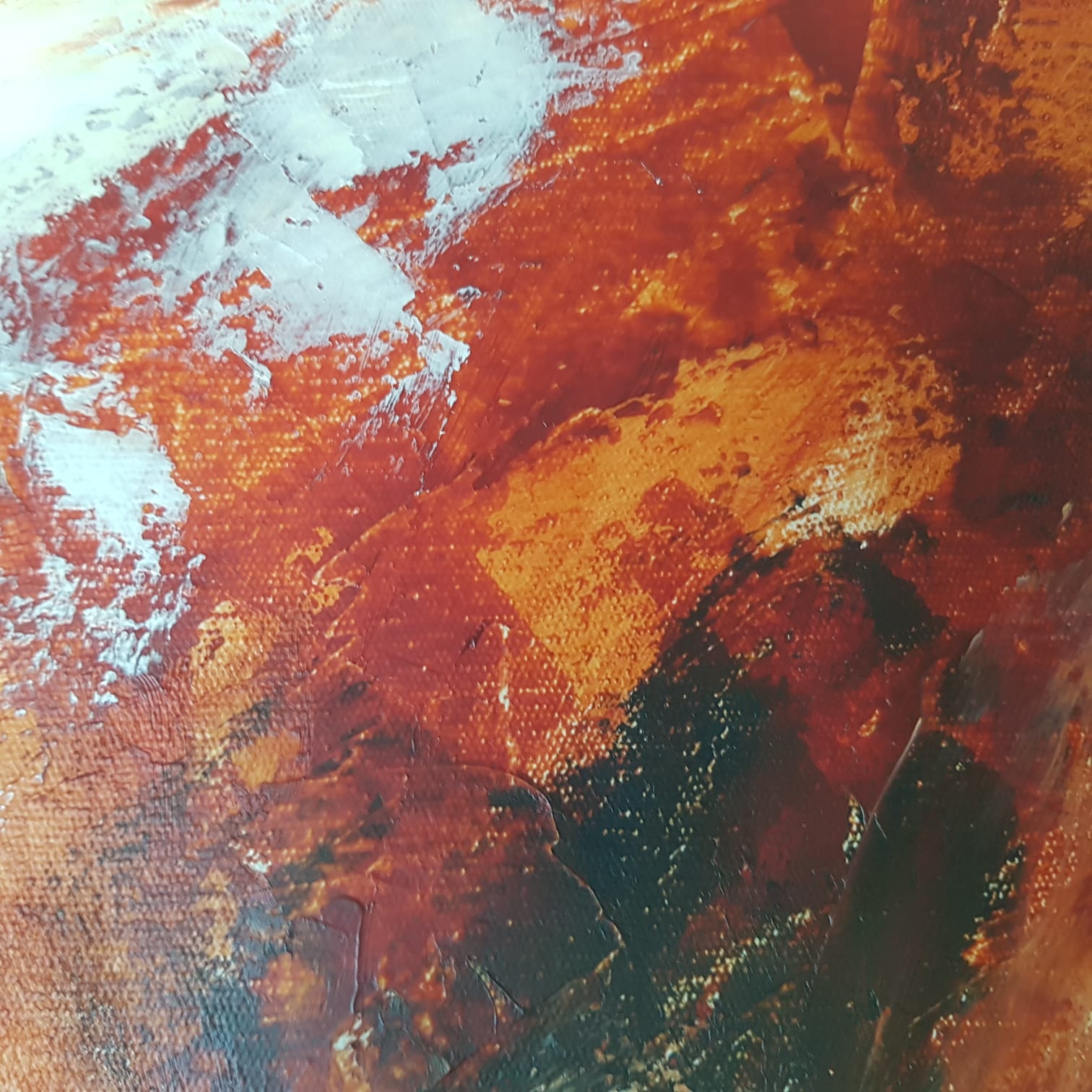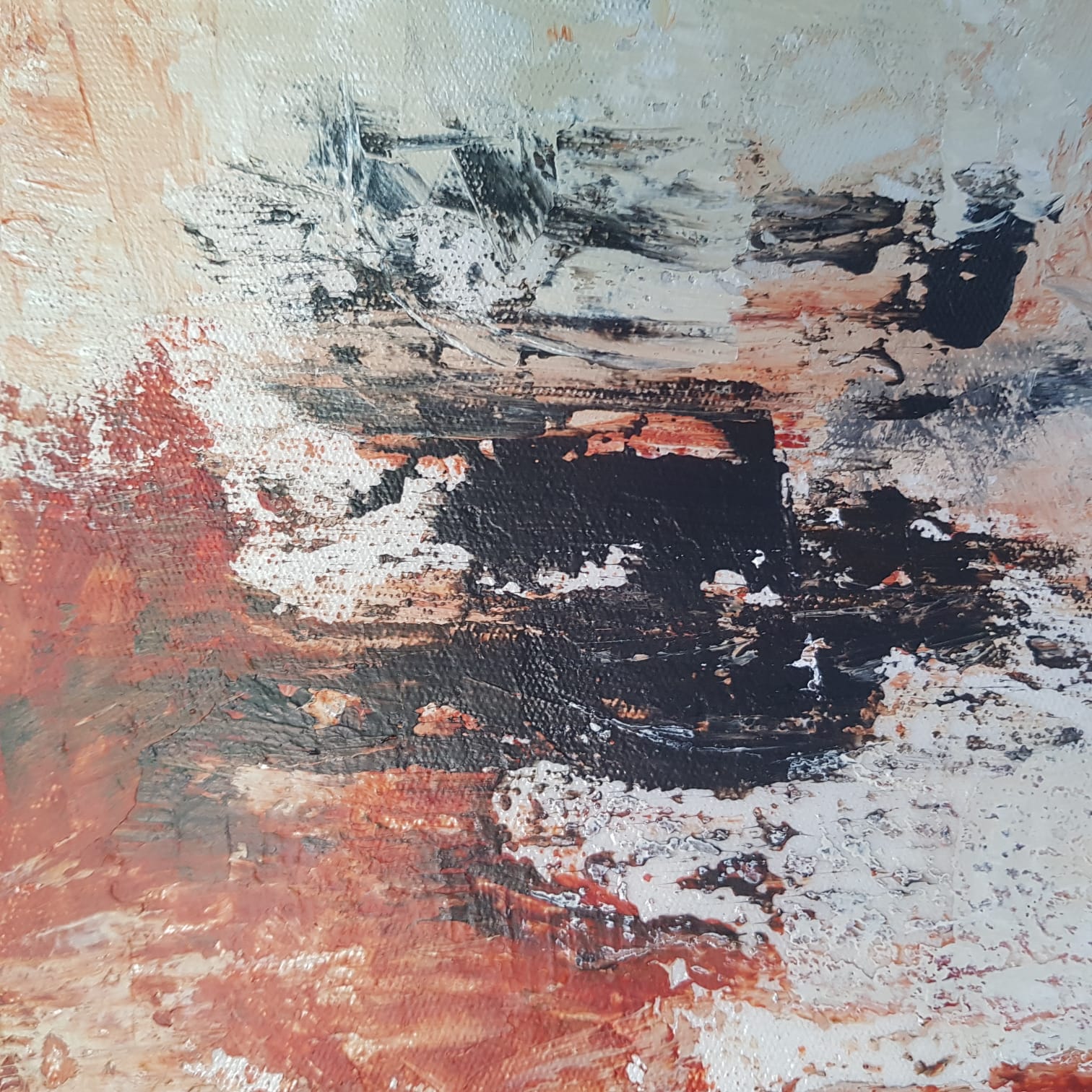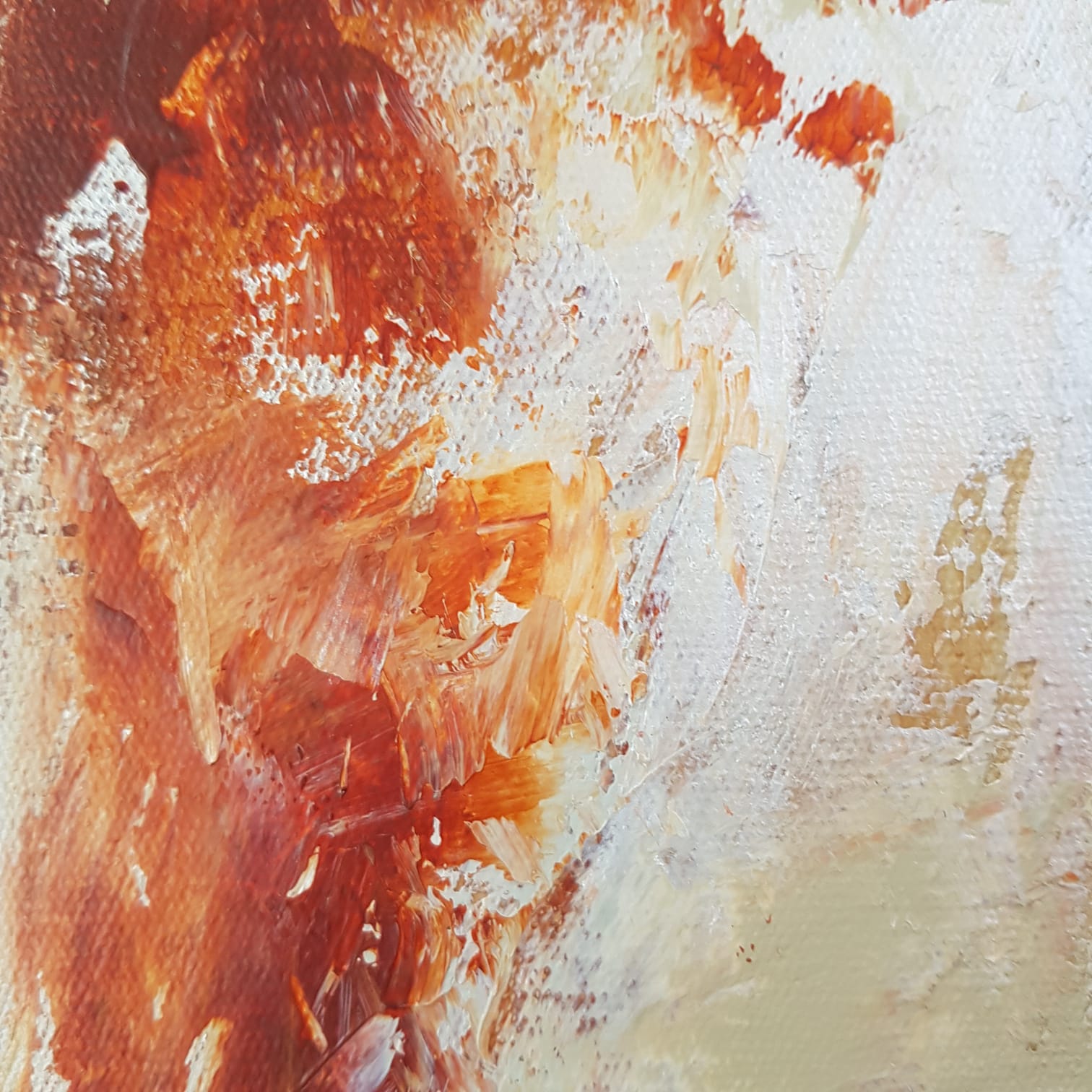 The canvas was prepared with an underpainting and then a heavy structure gel was applied with a palette knife to give texture to the background. Once the gel dried the paint was applied to the background and built up in layers to give an effect of scrub and bush.