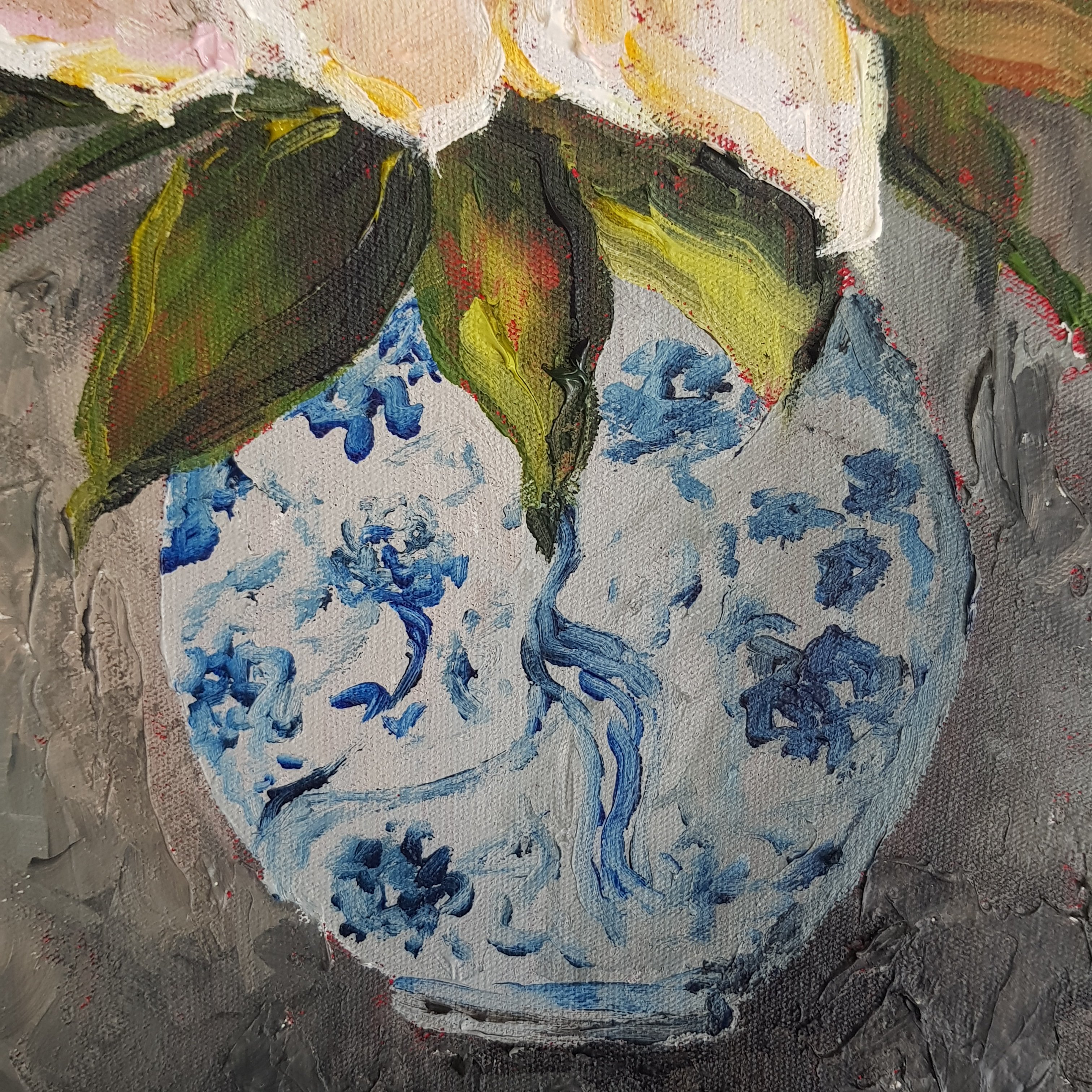 Slowly getting in to the swing of things for 2022. Working in the studio remains a challenge, because of the heat and the awful humidity. I need to investigate installing an AC for December through to February…. The rest of the year just isn’t necessary because the studio itself is nestled in the trees in the shade with beautiful bright light coming in through the windows. Overheating miseries aside, there is nothing better than painting my favourite subject matter – flowers and chinorserie vases!