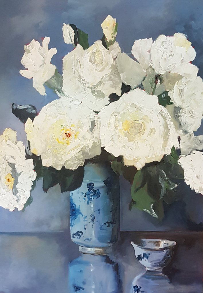 An addition of burnt umber gives depth to the shadows and reflections. The leaves are painted in a custom chrome green mix, and the roses are shades of white built up by a palette knife.