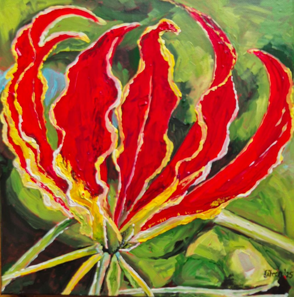 The African Flame Lily, scientifically known as Gloriosa superba is easily recognized by its distinctive bi-colored flowers, usually bi-colored yellow and orange-scarlet, that resemble flames. The flame lily has several common names, including climbing lily, creeping lily, glory lily, gloriosa lily, tiger claw, and fire lily. In certain regions, it is also referred to as Amakukhulume (Ndebele), Kajongwe (Shona), and Matalamanda (Tonga).
