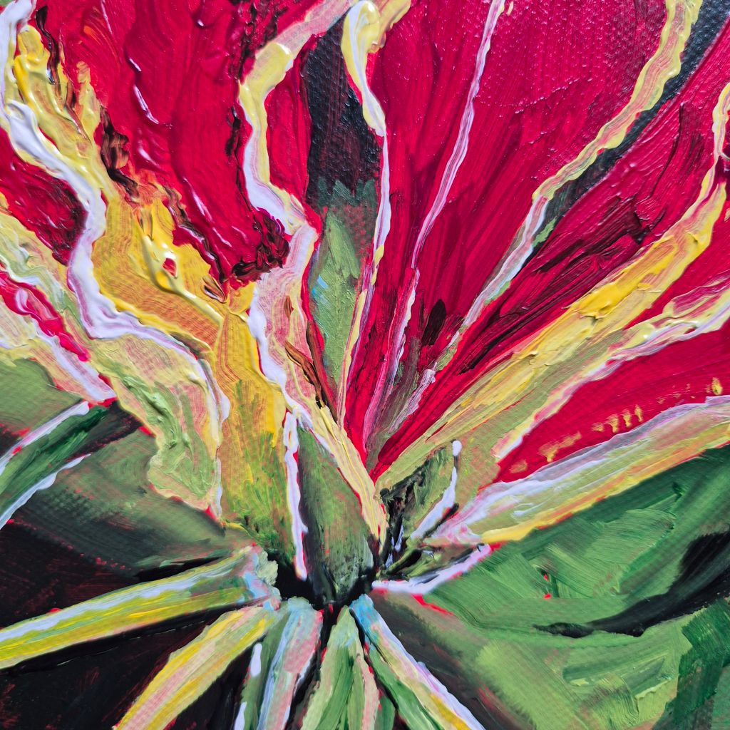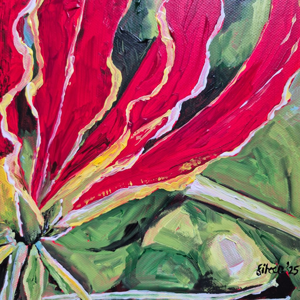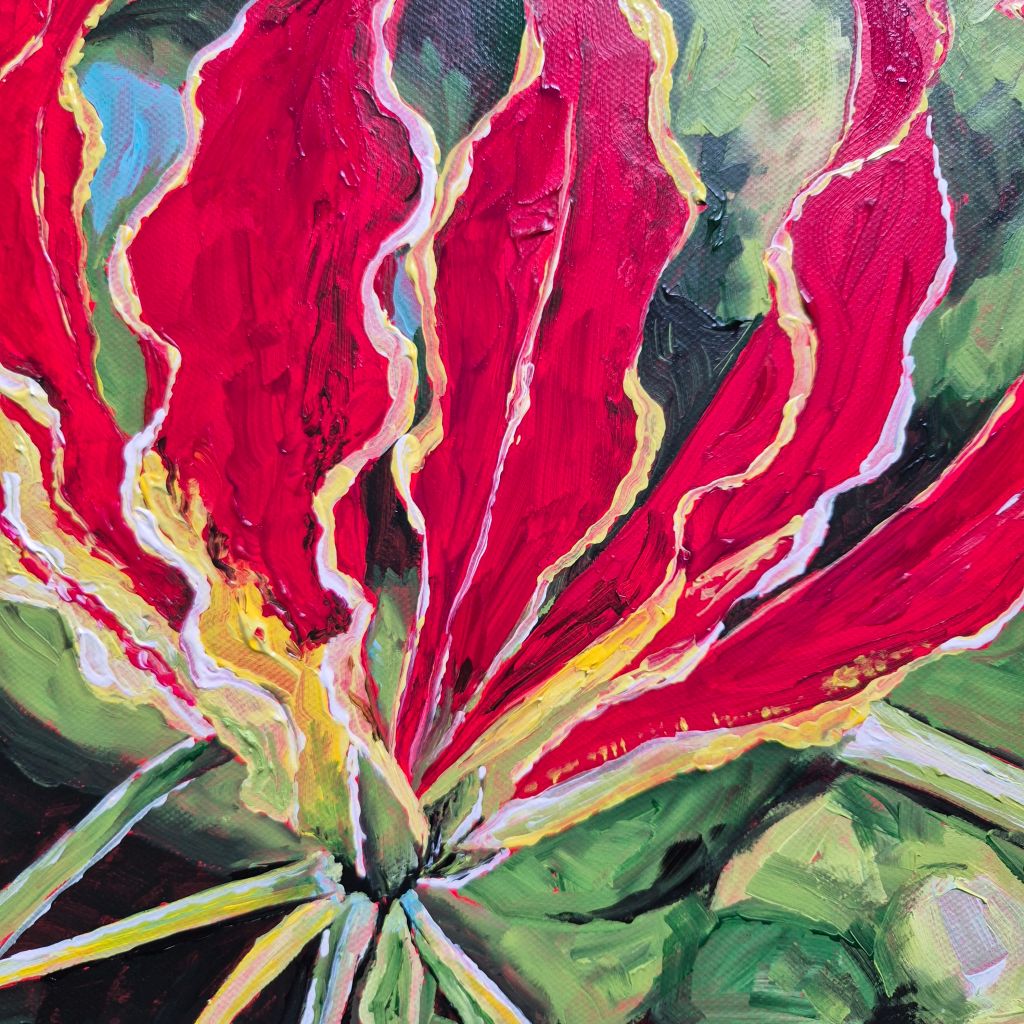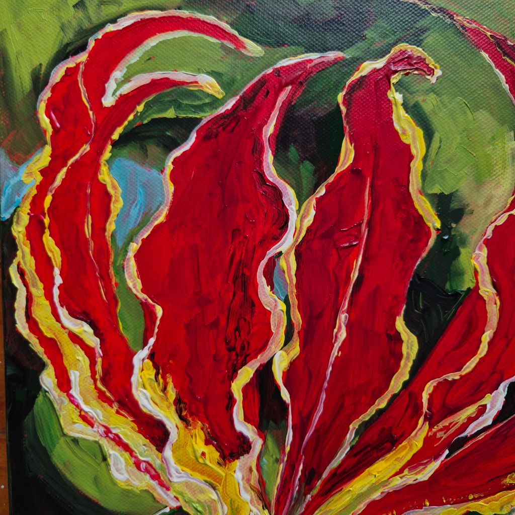 This flame lily was for a commission. The photograph was given to me to work from by a friend of the bride. The flame lily played star of the show in the flower arrangements on the bride and groom’s table.